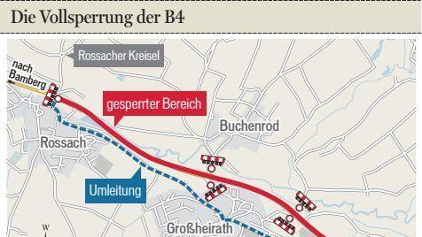 Engelhardt, der bei der Kronacher Servicestelle des Staatlichen Bauamtes Bamberg für das Gesamtprojekt "Oberbausanierung zwischen Untersiemau und Kaltenbrunn" zuständig ist, befürchtet beim ersten Bauabschnitt keine großen Behinderungen. Für die laut Verkehrszählung rund 5400 Verkehrsteilnehmer pro Tag gibt es schließlich die Möglichkeit, den gesperrten Abschnitt auf der ehemaligen Bundesstraße 4 zu umfahren. Der Weg über die Kreisstraße CO 12 und Großheirath nach Rossach und wieder zurück auf die B 4 ist nur minimal länger und auch tauglich für den Schwerlastverkehr.