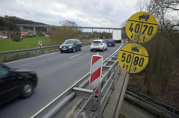 Ein bisschen anders wird es dann im September/Oktober, wenn die alte Füllbachbrücke abgerissen und durch zwei Wellenstahl-Durchlässe ersetzt wird. Für diese Phase rechnet das Staatliche Bauamt, dass die B303 für sechs Wochen komplett dicht ist. Recht glücklich sind die Straßenbauer mit dieser Tatsache nicht, schließlich ist die Bundesstraße eine wichtige Umleitung, wenn denn die nahe Autobahn 73 einmal gesperrt werden müsste. Dennoch fiel die Entscheidung für eine Vollsperrung, weil eine Umfahrung der Baustelle über eine Behelfsbrücke zu aufwändig gewesen wäre.