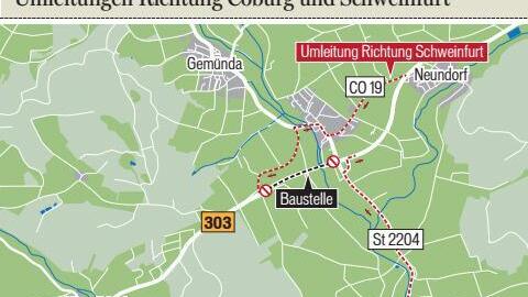 Mit im Schnitt 6234 Fahrzeugen pro Tag ist die Bundesstraße 303 zwischen Coburg und Schweinfurt eine der am stärksten befahrenen Straßen in der Region. Ab dem kommenden Montag müssen sich die Autofahrer auf dieser wichtigen Ost-West-Verbindung auf erhebliche Behinderungen einstellen: Dann wird die Straße zwischen dem Brückenbauwerk bei Dietersdorf und der Abzweigung nach Muggenbach komplett für den Verkehr gesperrt. "Wir gehen davon aus, dass die Sperrung am 24. Oktober wieder aufgehoben wird", teilte Harald Schnappauf von der Kronacher Servicestelle des Staatlichen Bauamtes Bamberg gestern bei einer Vorbesprechung zum Ablauf der Baumaßnahme mit.