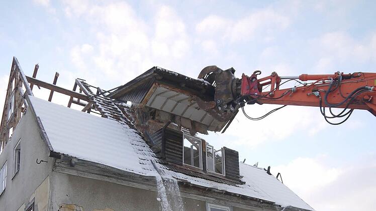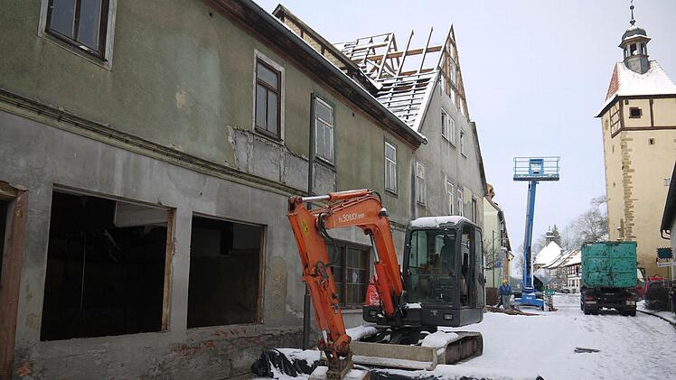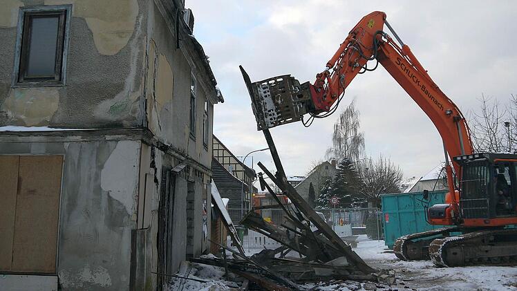 Während sich der Bagger in die Fassade neben der Hildburghäuser frisst, macht sich beim Bürgermeister spürbar Entspannung breit. Zu lange standen schließlich die aufgrund ihrer Lage eigentlich interessanten Häuser leer. Selbst beim mittleren Gebäudeteil muss Dirk Hochberger schon in ganz alten Erinnerungen graben, um dann auf das Kurzwaren-Geschäft zu gekommen, das einst dort seine Heimat hatte. "Das ist doch schon 30 Jahre her", vermutet der Bürgermeister. Seitdem hat der Zahn der Zeit kräftig am Haus genagt, jetzt war es "höchste Eisenbahn" für den Abriss, sagt Ehrlicher. Teilweise waren schon Deckenteile eingebrochen, das Dach sowieso schon Jahrzehnte undicht.