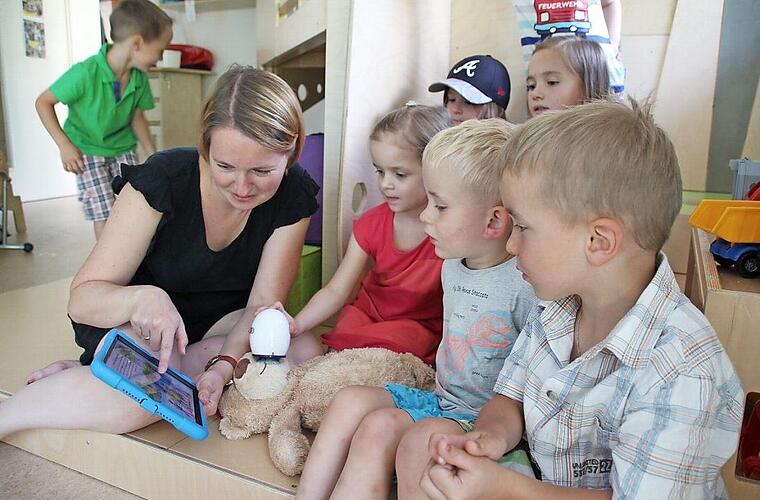 Auch das Vorlesen von Bilderbüchern in der Gruppe wird durch das IPad einfacher. Mittels Beamer werden die einzelnen Seiten an die Wand projiziert und alle Kinder können wie im Kino drumrum sitzen und der Erzieherin beim Vorlesen zuhören. "Das soll natürlich nicht das Vorlesen ersetzen, wenn ein Kind mal etwa mehr Zuwendung oder Trost braucht", sagt Anders Fuchs, der immer wieder betont, dass es nur um den Gebrauch des Geräts in der Gruppe geht. Weder das freie Spiel noch die Zeit draußen im Garten leiden unter dem Einsatz des IPads. "Wir möchten die notwendigen und immer wichtiger werdenden Fähigkeiten bei Kindern fördern: Kommunikation, Kreativität, Teamgeist, Methodik und Kritikfähigkeit", sagt Fuchs im Hinblick auf die Berufe, "die unsere Kinder irgendwann ergreifen und die wir ja noch gar nicht kennen".
