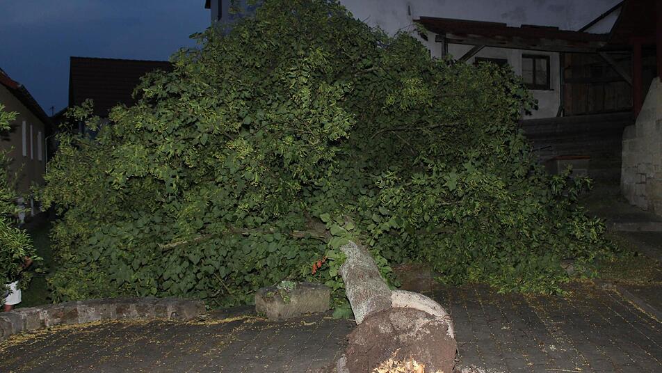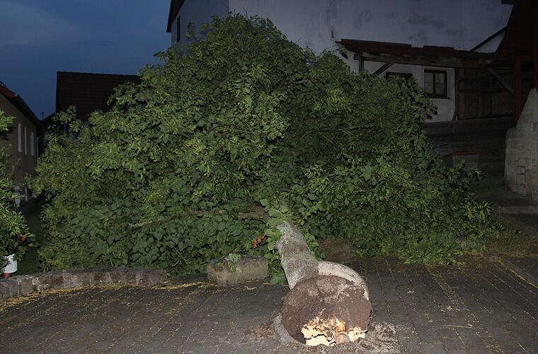 Am Dienstagabend fiel der stattliche Baum vor der Alten Schmiede in Gemünda, Ende der 80er-Jahre gepflanzt, dem kurzen Sturm zum Opfer.