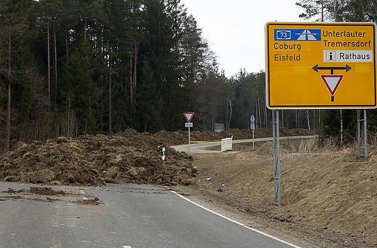 Die unmittelbare Zufahrt zu der Wiese wurde inzwischen aufgebaggert, um die dort verlegten Betonrohre auszutauschen. Der Erdaushub, der vom Landkreis auf diesem Straßenabschnitt zwischengelagert wird, bis entschieden werden kann, ob er auf Nutzflächen ausgebracht werden kann oder anders zu entsorgen ist, versperrt auch eine letzte kleine Zufahrt durch den Wald.