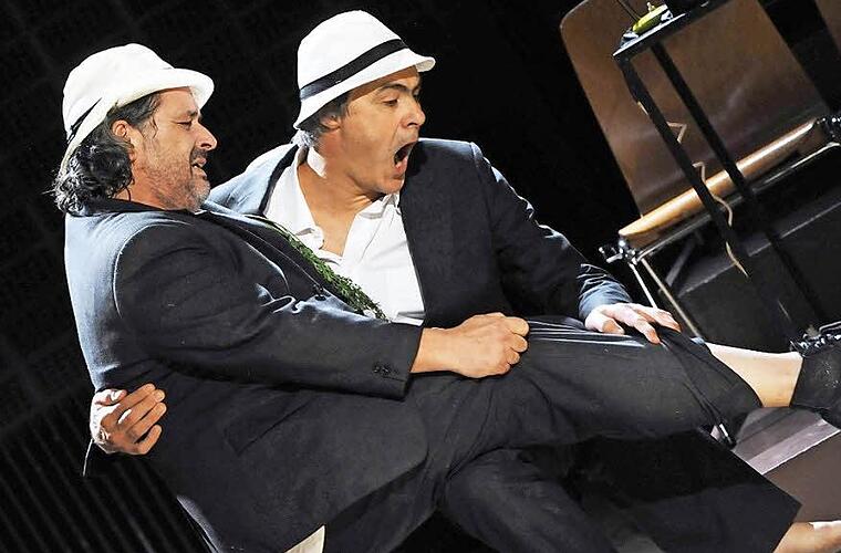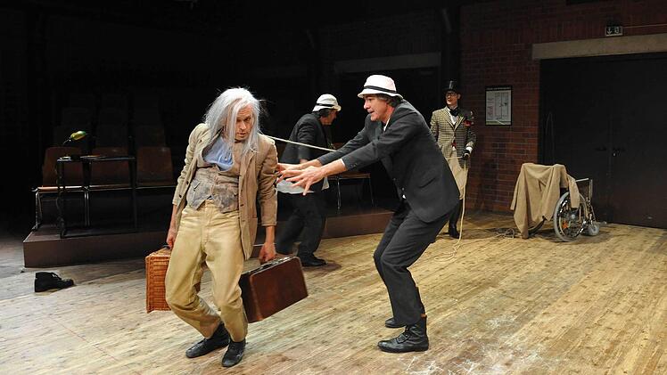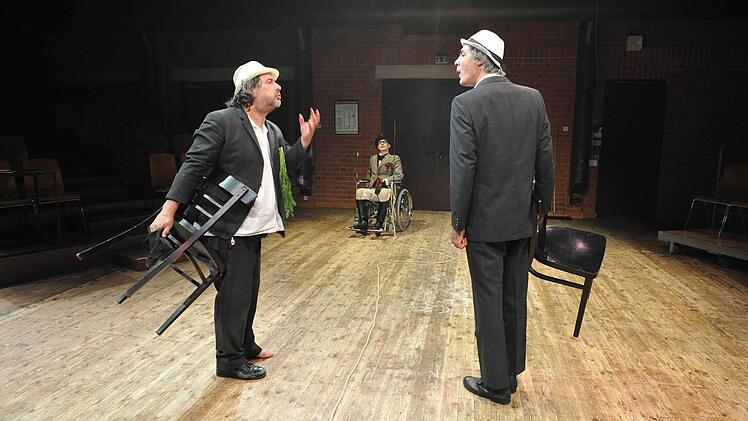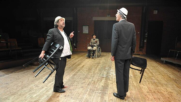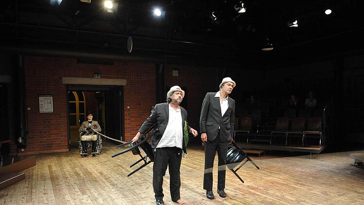 Zwei abgetragene Anzüge, zwei zerknautschte helle Hüte, dazu zwei schwarze Stühle und eine weiß gestrichene Holzscheibe hoch droben über der Bühne als Mond, später noch einen Rollstuhl, einen Koffer, einen Picknickkorb und einen langen Strick - mehr braucht Gastregisseur Johannes Zametzer nicht, um Samuel Becketts Schauspiel auf die Bühne zu bringen.