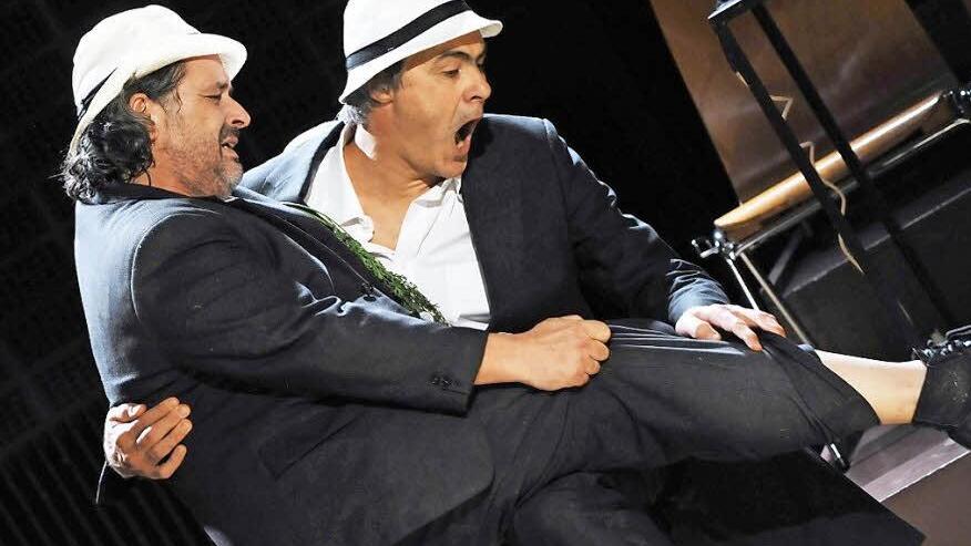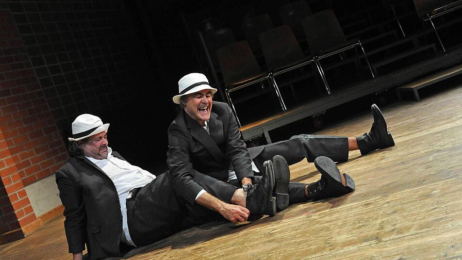 Der Abend beginnt wie ein Spiel. Tango-Klänge schweben durch die Coburger Reithalle. Und während das Premierenpublikum langsam seine Plätze sucht, probieren die beiden Schauspieler Stephan Mertl und Helmut Jakobi scheinbar beiläufig die Requisiten für ihre Rollen als Estragon und Wladimir in "Warten auf Godot" aus.
