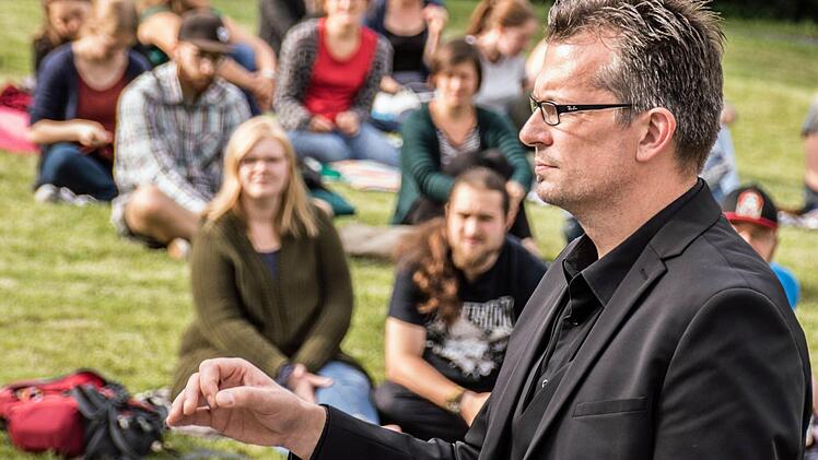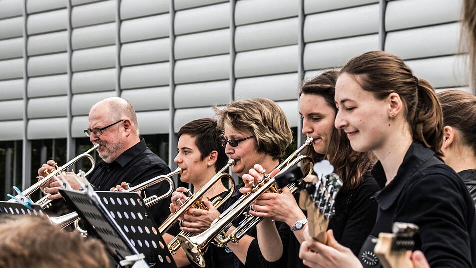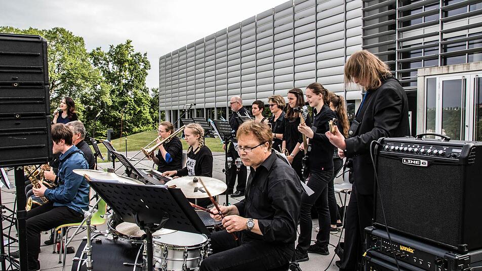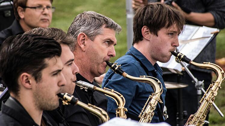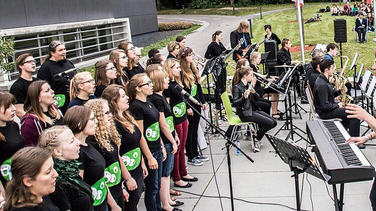 Während sich die Wiese vor der Aula und die in der Wiese platzierten steinernen Bänke mit Zuhörern füllen, bietet die Bigband der Hochschule einige Ausschnitte ihres aktuellen Repertoires - von "Somewhere over the Rainbow" bis "Skyfall" von "Blue Moon" bis "Night and Day".