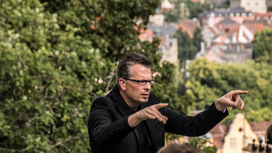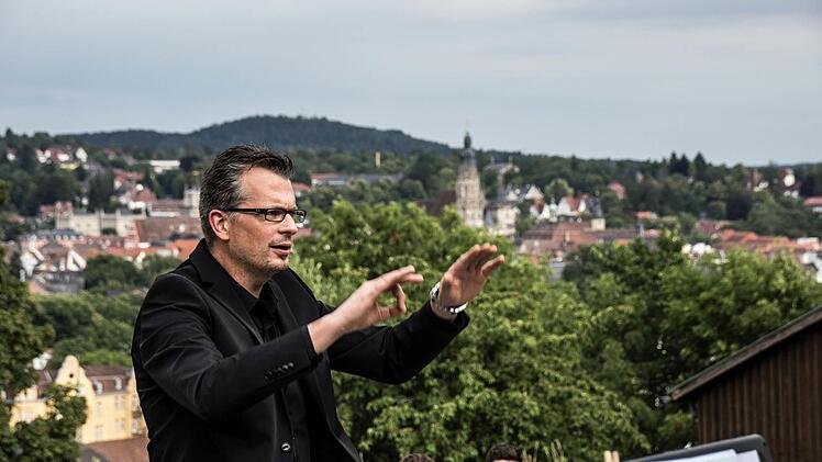 Als Dirigent am E-Piano ist Moritz Metzner auch bei dieser Serenade der stets anspornende Impulsgeber. Während sich immer dichter dunkle Wolken von Nordwesten her Richtung Coburg schieben, singen "Die Klangfänger" mit frischem, lebendigem Klang "Wir bleiben wach, bis die Wolken wieder lila sind."