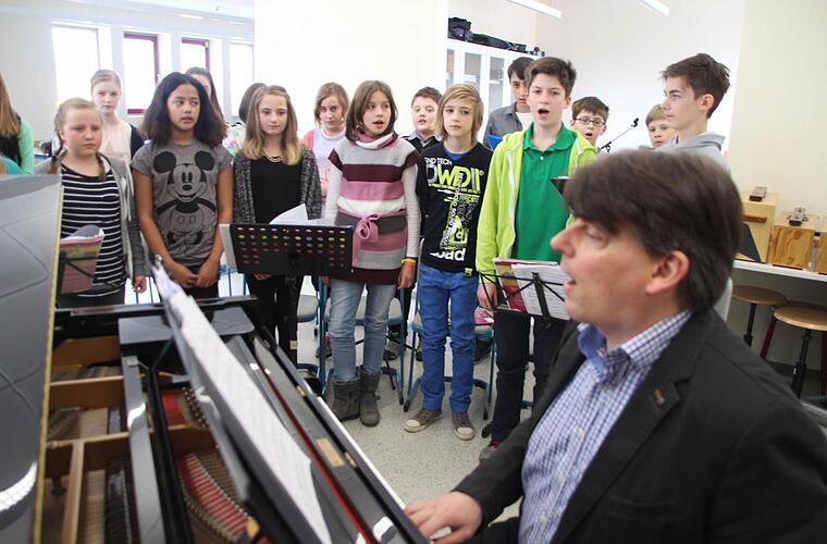 "Wir wollen den Kindern einen bewussten Umgang mit der eigenen Stimme beim Singen und Sprechen vermitteln", erläutert Hintsche das Konzept. Ein Stippvisite im Unterricht macht deutlich, von was er spricht. Das Niveau, auf dem Kinder die Lieder und Tonleiter singen, ist für ihr Alter überdurchschnittlich hoch. Die Elf- und Zwölfjährigen singen bereits dreistimmig und können - rein nach Gehör - die Noten eines Liedes aufschreiben, das Florian Hintsche am Klavier vorspielt. "Ein zweistimmiges Lied studiere ich mit den Schülern in zehn Minuten ein", sagt er selbstbewusst. Wie er das macht? "Die Schüler üben durch Solmisation, das heißt die Kinder singen Silben und machen dazu bestimmte Hand- und Fingerbewegungen."