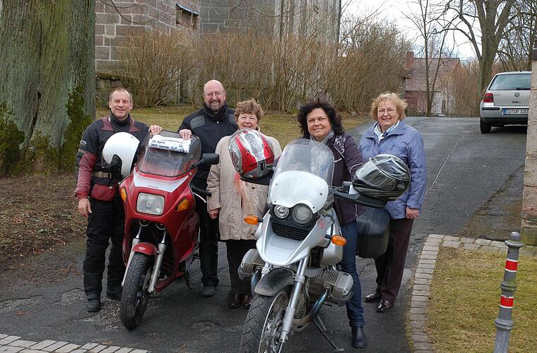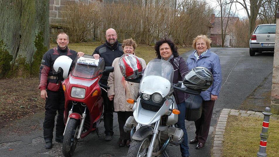 Motorradfahrer treffen sich an der Dorfkirche zum Gottesdeinst. Sie beten für eine heile Saison und sammeln Spenden für die Selbsthilfegruppe "Verwaiste Eltern Coburg".