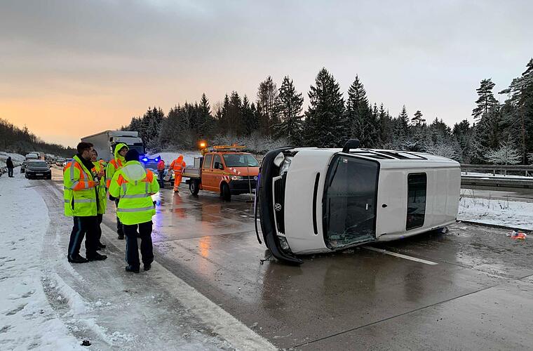 Ein erster Unfall ereignete sich laut Polizeibericht gegen 06:30 Uhr im Gemeindebereich Lautertal. Hier herrschten winterliche Straßenverhältnisse, die linke Fahrspur war noch schneebedeckt und auch die rechte Fahrspur war nicht vollständig schneefrei. Hier fuhr ein 57-Jähriger aus Eisfeld mit seinem Ford Transit in Richtung Feucht. Etwa zwei Kilometer nach der Anschlussstelle Eisfeld überholte der Kleintransporter langsamere Fahrzeuge auf der rechten Spur. Trotz Winterbereifung verlor der Fahrer des Kleintransporters beim anschließenden Spurwechsel wegen überhöhter Geschwindigkeit die Kontrolle über sein Fahrzeug.