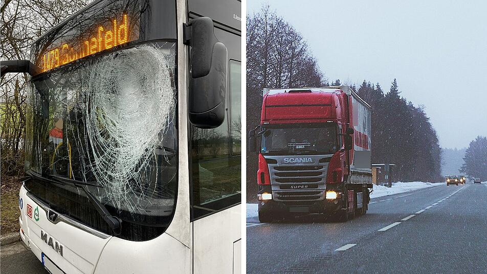 Ein Sattelzug verlor auf der Kreisstraße CO11 Eisplatten, die einen Linienbus beschädigten. Die Polizei sucht nach dem verantwortlichen Fahrer des orangefarbenen LKWs ohne Beschriftung.