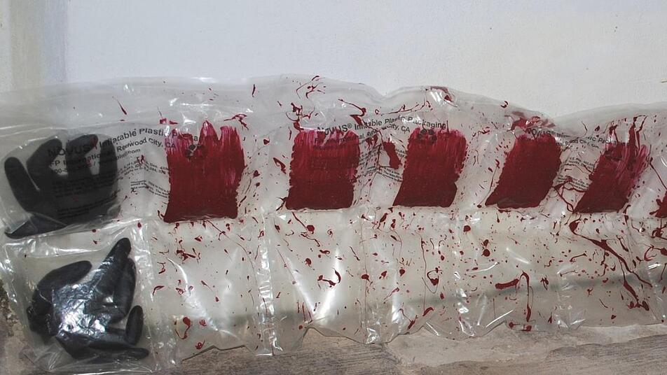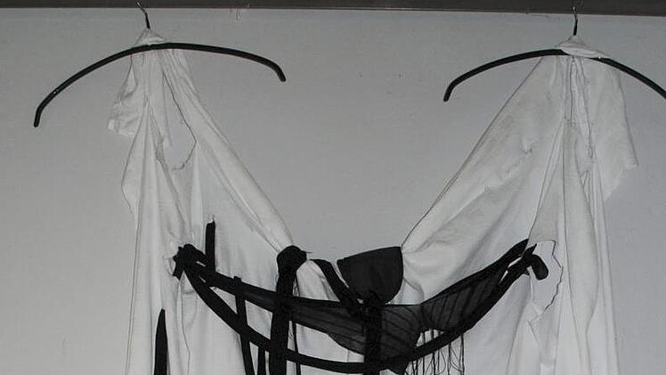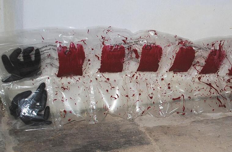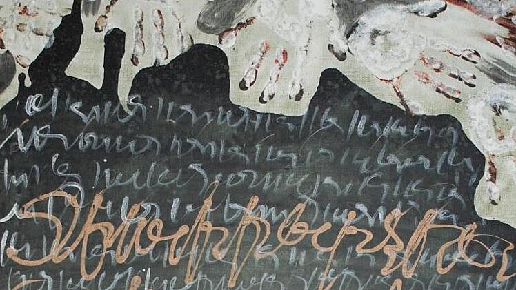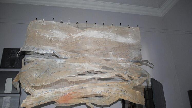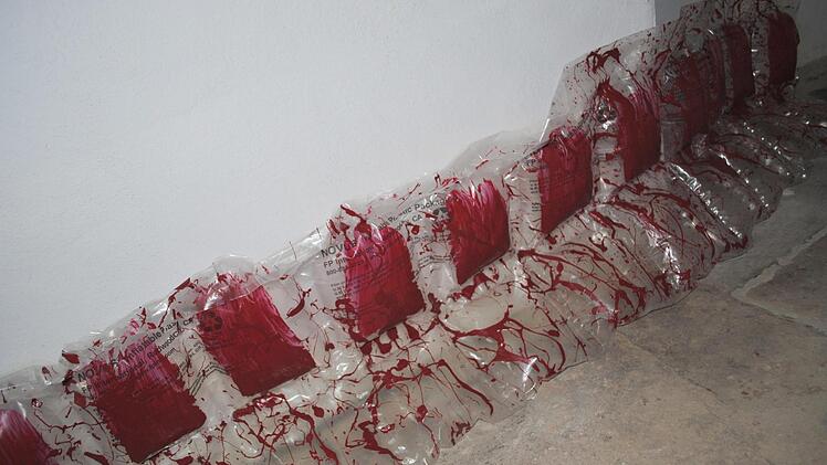 So hängt nun über den Keramiken ein mit Farbe und weiteren Materialien gestaltetes Vlies. Die Reihe mit roter Farbe gefüllter und bespritzter Beutel dort unten an der Wand, Blutbeutel, löst Schauder aus. Vera Schnitzers "letzter Engel" ist ein drapiertes weißes Tischtuch voller Risse, aber auch voller Schriftbotschaften.