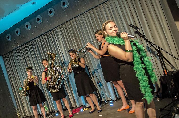 Mit kurzen szenischen Zwischenspielen verschaffen sich Isabella Hauser und Hedwig-Martha Emmerich (Trompete), Katharina Obereder (Posaune), Franziska Lehner (Horn) und Christina Schauer (Tuba) immer wieder kurze Verschnaufpausen zwischen den einzelnen musikalischen Stücken. Dazwischen gibt es immer wieder effektvoll präsentierte Gesangsnummern. Jede Instrumentalistin verdient sich dabei auch als Sängerin Sonderapplaus des begeisterten Publikums.