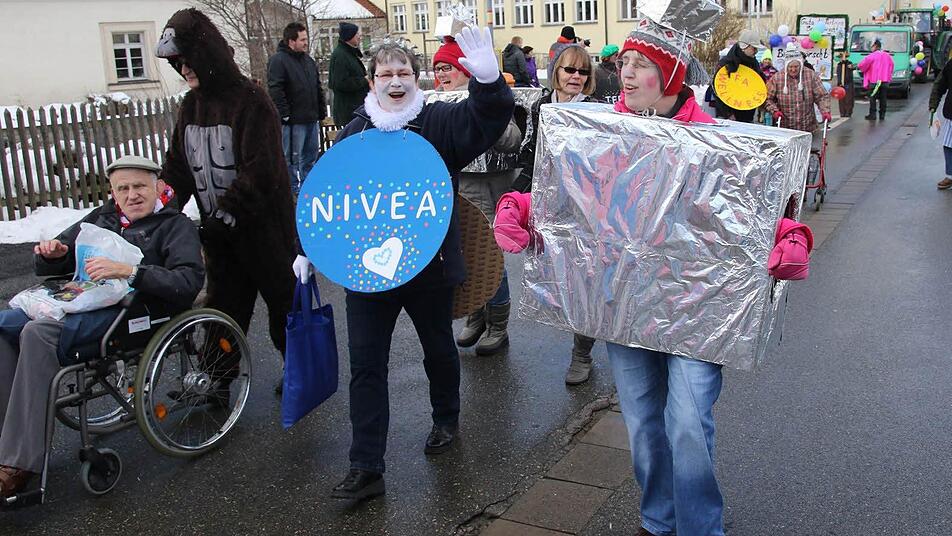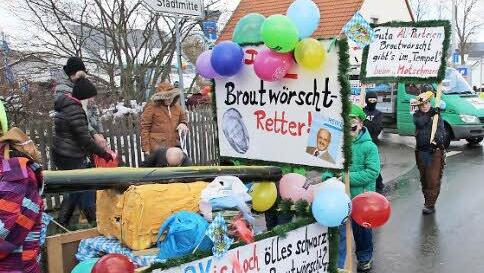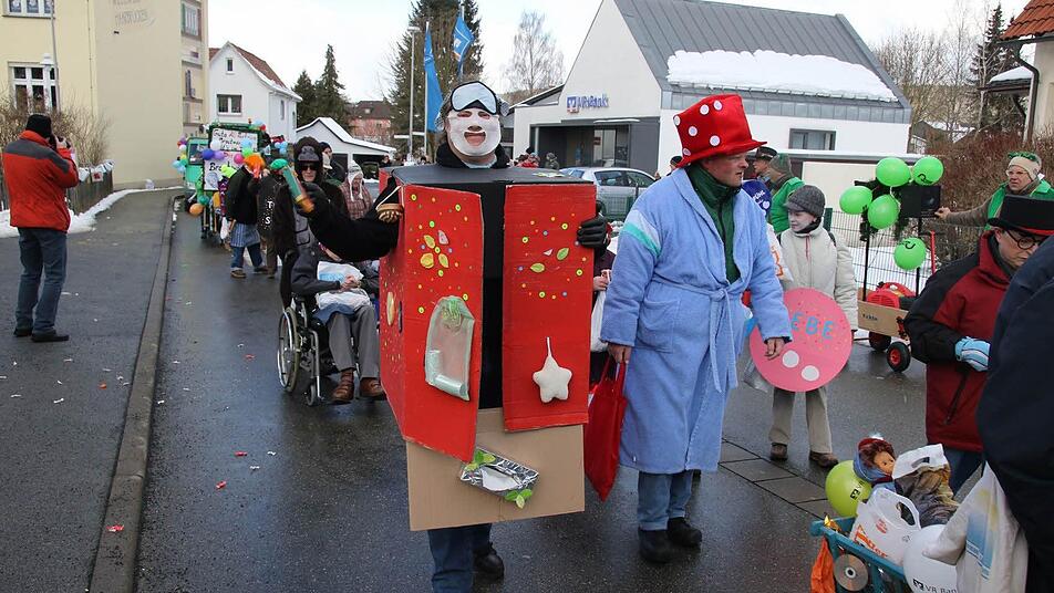 /> Für die nötige Stimmung im Zug sorgten auf der rund 3,5 Kilometer langen Zugstrecke, zwei Blaskapellen. Auch einige Zentner Bonbon wurde von den großen und kleinen Narren in die Massen geworfen. Der Gaudiwurm, wurde von einem Ausläuter in alter Feuerwehruniform und von den Kindern aus dem Kindergarten Wildenheid, die auf die Mülltrennung aufmerksam machten, angeführt.