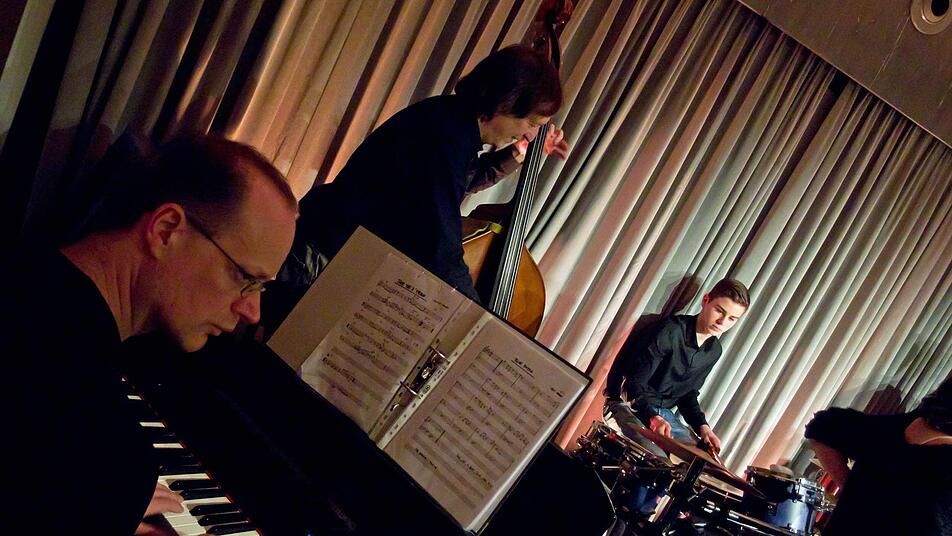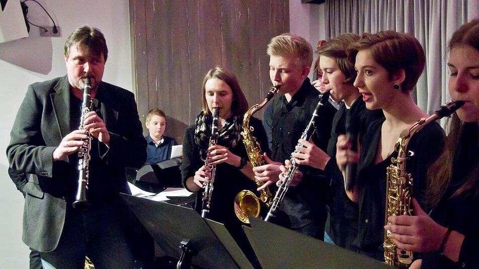 Umsichtig und anspornenden leitet Plitzner die "Albert's Jazzband", die in diesem Schuljahr einen großen personellen Umbruch zu verkraften hat. Gut, dass einige Ehemalige die Jazzband an diesem Abend unterstützen. Das erleichtert hörbar das Bestreben, sich musikalisch frei zu schwimmen.