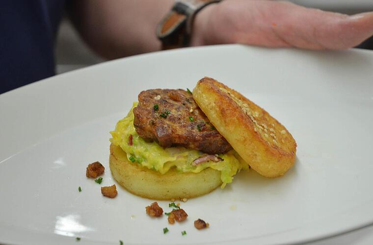 "Wir könnten zum Beispiel den Paddy mit etwas panieren, oder uns etwas Interessantes einfallen lassen, was wir oben drauf packen", überlegt er. Dann geht es los. Am Ruhetag wird in der Küche des "Auerhahn" ausprobiert. Zum Beispiel mit Ananas. Hawai-Burger? Weit gefehlt. Die Ananas wird eingelegt in eine Marinade. Senf spielt eine Rolle, Nelken und Zimt ebenso. Alles wird nicht verraten. Mit 200 Gramm bestem Rindfleisch, Tomaten, natürlich Käse und einem besonderen Bun (Brötchen) wird daraus ein Burger, der schon mal nicht alltäglich ausschaut. Ein wenig Knoblauch hier, etwas gegrillter Ruccola dort, und auf dem Teller präsentiert sich etwas, das durchaus einen Platz auf der Karte eines guten Restaurants verdient.