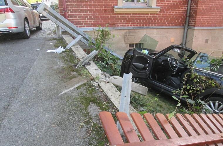 Einen Sachschaden von über 20 000 Euro gab es am Montag in Coburg, als ein 71-Jähriger mit dem Auto eine Leitplanke durchbrach und gegen eine Hauswand fuhr.