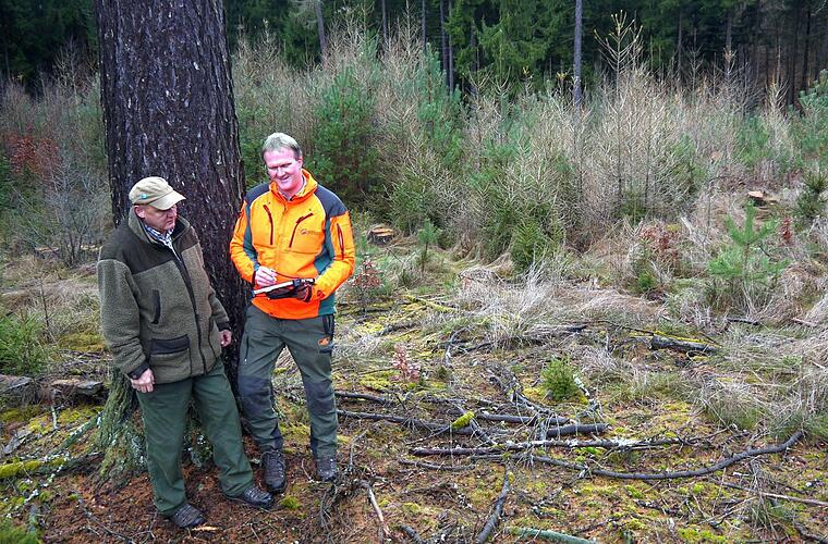 Mit einem zufriedenen Grinsen schauen Forstwirtschaftsmeister Norbert Seitz und Betriebsleiter Albert Schrenker auf die Ergebnisse der diesjährigen Nadelwertholz-Submission der bayerischen Staatsforsten. Bei der Veranstaltung in Himmelkron hat der Forstbetrieb Coburg der Bayerischen Staatsforsten schließlich die "Braut" der Versteigerung, also den Baum mit dem besten Verkaufspreis, gestellt. 580 Euro pro Festmeter war einem Bieter eine Lärche aus dem Forstrevier Mönchröden wert. "Schöne Bäume gehen immer weg wie warme Semmeln", sagt Schrenker zu diesem Preis.