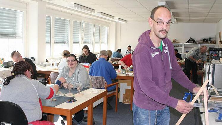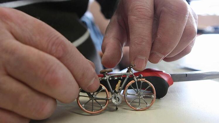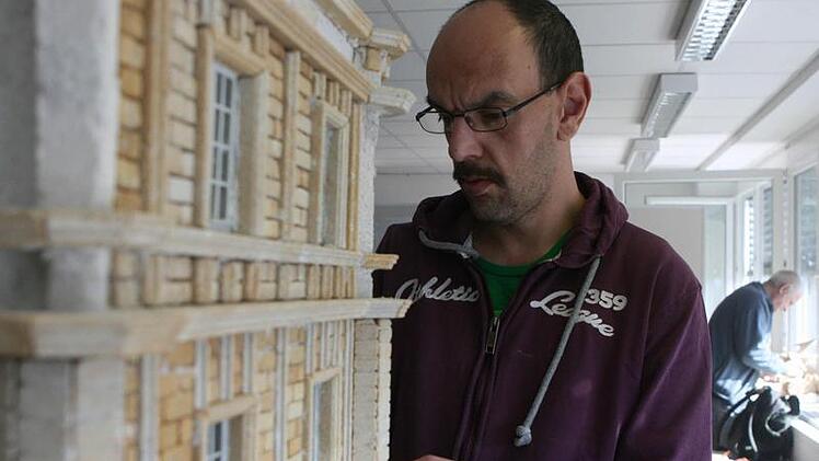 Stoganov ist einer von 70 Teilnehmern, die bisher am Projekt beteiligt waren. In der Werkstatt in Dörfles-Esbach wurden seit eineinhalb Jahren Pläne entworfen, Fotos vom Original übertragen, Sandsteine geschliffen und Mauern hochgezogen. Alles mit Materialien, die auch bei einem richtigen Bau zum Einsatz kommen. "Das, was die Menschen in klein lernen, soll auch möglichst ins Große übertragbar sein", sagt Anja Boller vom Berufsförderungswerk. Elemente wie Geländer oder Mini-Fahrräder werden aus Kupferdraht gelötet. Nichts anderes machen Elektriker. Und auch die Maße müssen stimmen.