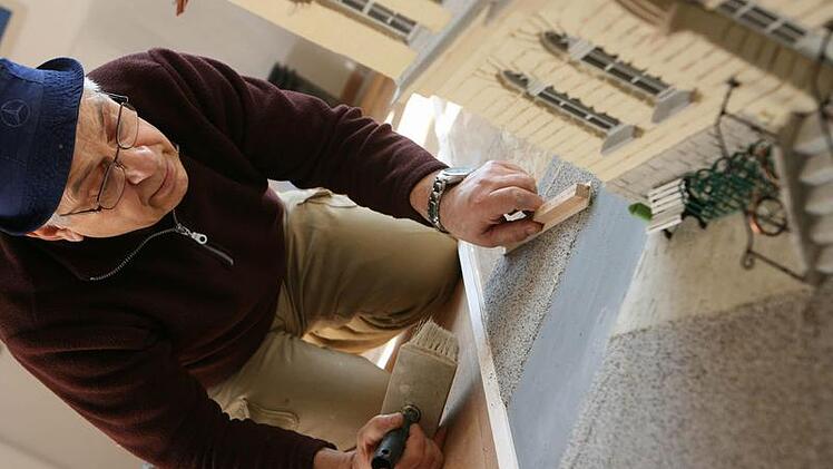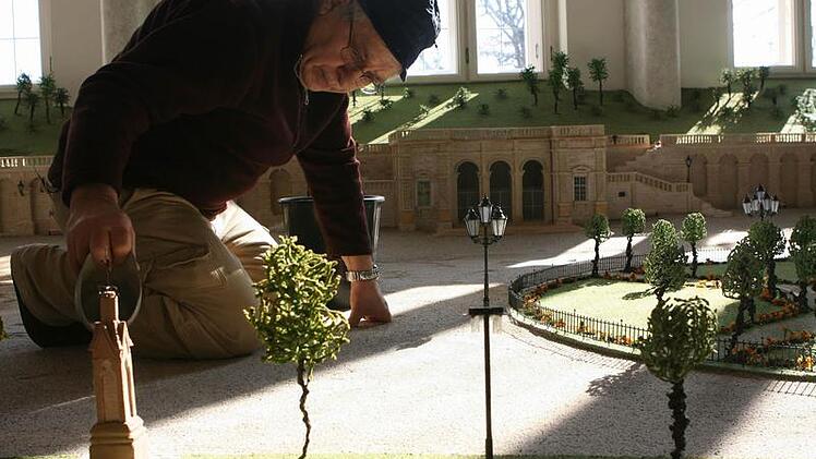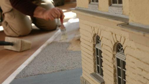 Andreas Seubert legt die Wasserwaage an, befestigt die Friese an der Außenfassade der Mini-Ehrenburg. Danach kann er Sandsteine auf die Mauern, die aus fünf Zentimeter starken Ytongsteinen gebaut sind, kleben. Der kräftige Mann war früher Maurer, deshalb ist das sein Job. Er baut an der Ehrenburg, die ab Herbst zu sehen sein wird.