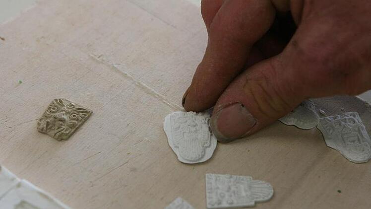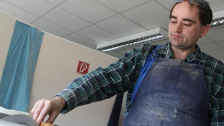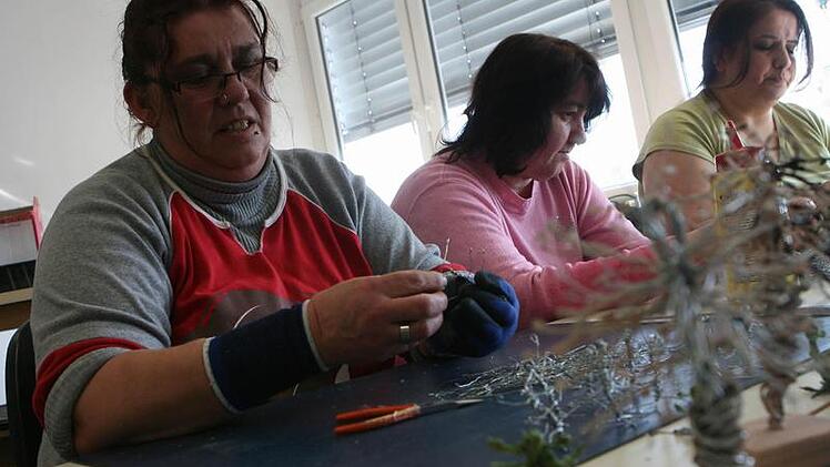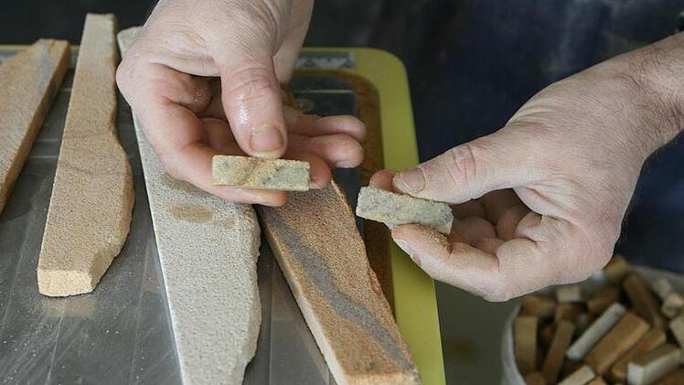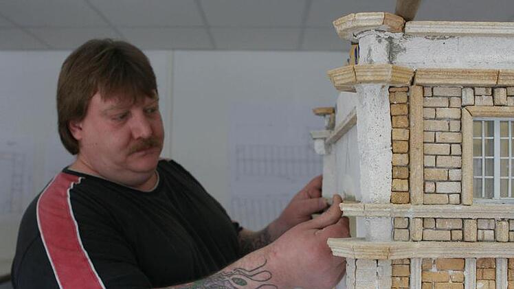 Ralf Schneider schneidet die Steine zurecht. Der 43-Jährige war früher Schlosser: "Ich habe Treppen gebaut" - damit kennt er sich aus - jetzt hat er die Treppen an den Arkaden angefertigt - aus Sandstein. Ein völlig neues Material für ihn, aber eins, das ihm liegt: "Mit Holz arbeite ich nicht so gerne", sagt er. Im Raum nebenan sitzen 20 weitere Frauen und Männer, die Bäumchen aus Draht drehen, die Fensterchen mit Holzsprossen versehen und die Friese gießen.