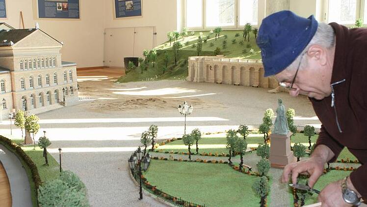 Es ist eine Modelllandschaft im Maßstab 1:25, auf dem der Riese mit Hut kniet. Hier im Naturkundemuseum wird am Sonntag die Sonderausstellung "Coburg in Miniatur" eröffnet. Ein Projekt des Jobcenters Coburg und der Coburger Geschäftsstelle des Berufsförderungswerkes Nürnberg, das Langzeitarbeitslose in neue soziale Strukturen integrieren - und in Arbeit bringen will. Das haben bisher elf Teilnehmer geschafft.