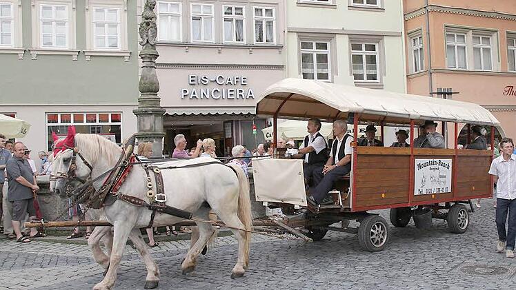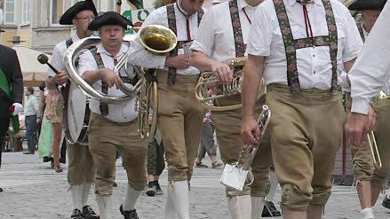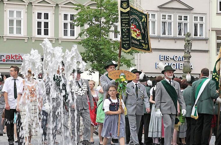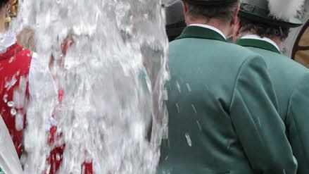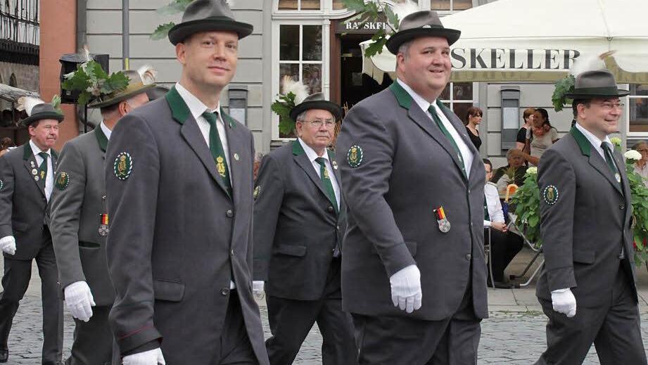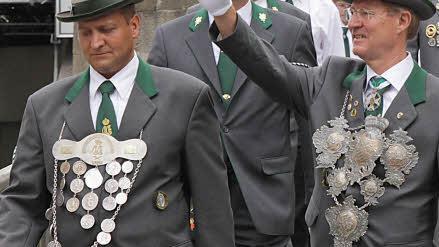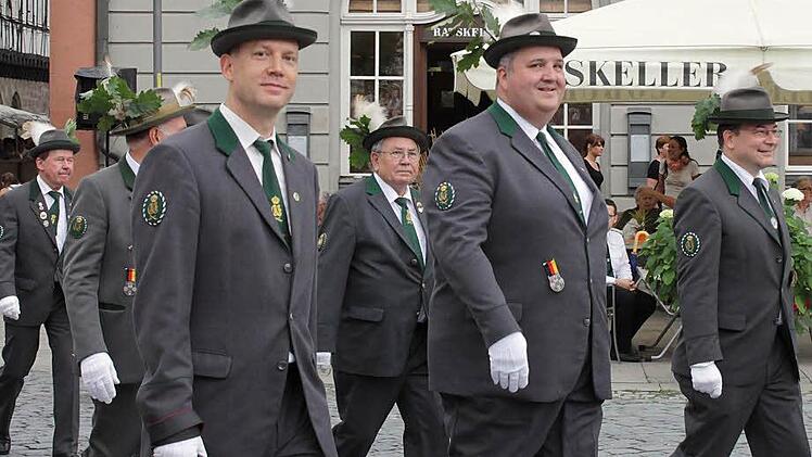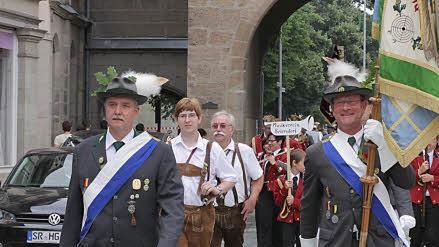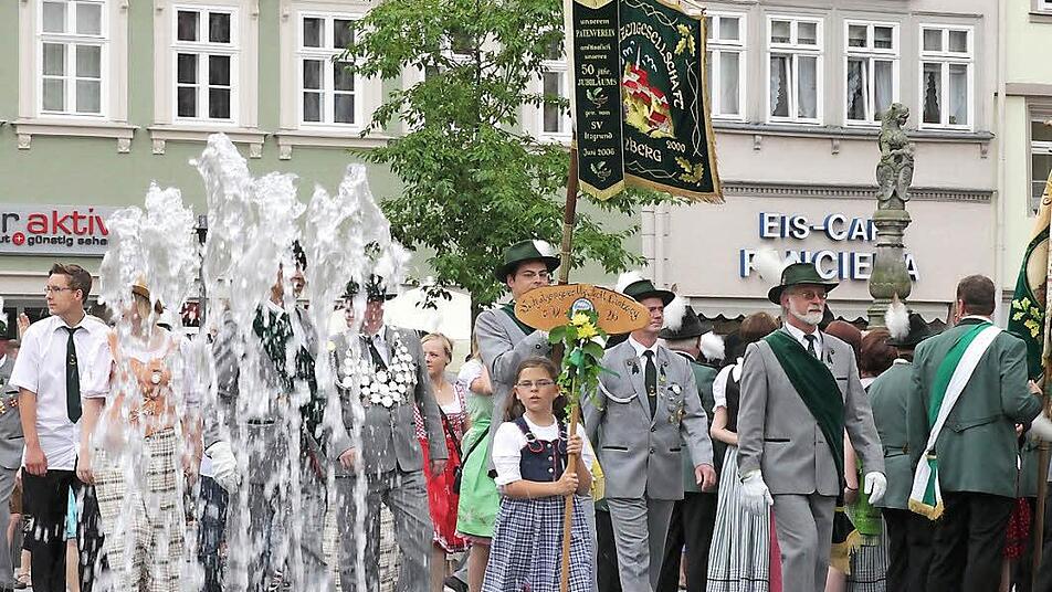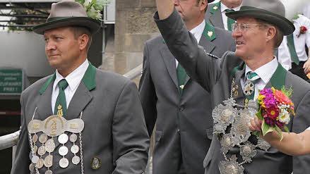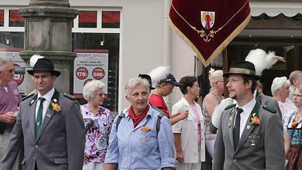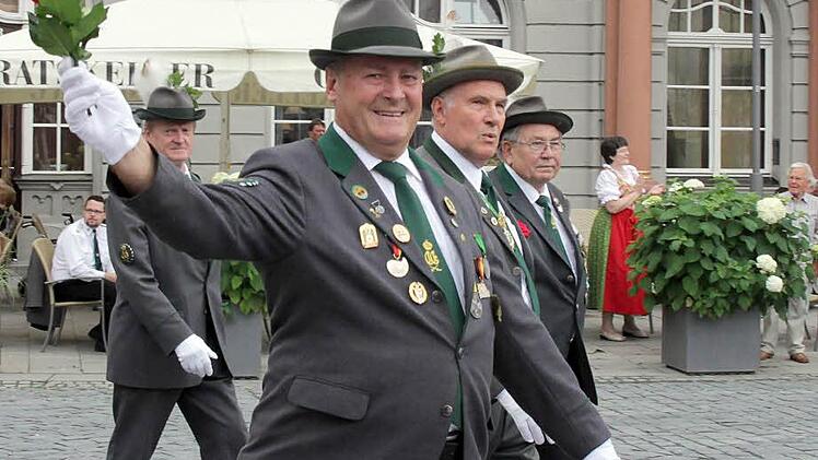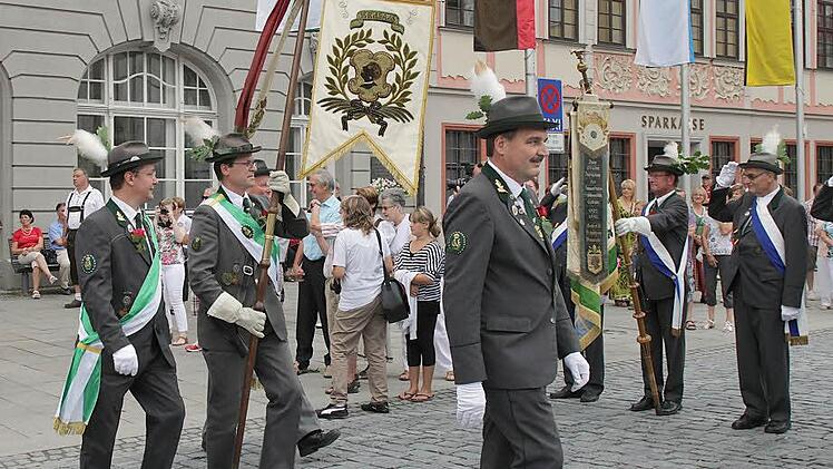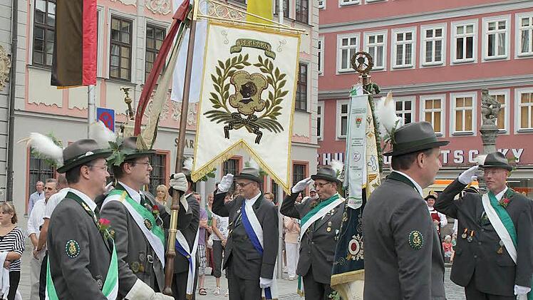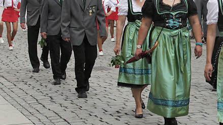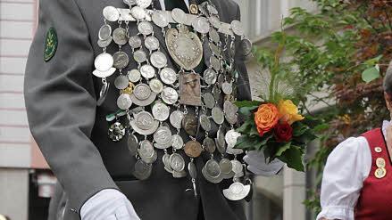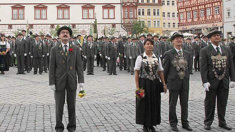 Schwer behangen mit mächtigen Schützenketten, weiße Handschuhe lugen vorne unter den dunkelgrünen Manschetten hervor, Schlips und Kragen pressen den Hals zusammen - aber: "Wir haben richtig Glück", sagt eine Schützenschwester aus Lichtenfels. Das Wetter hätte ja noch viel heißer werden sollen. Und die Männer wollten unbedingt ihre Uniformen tragen.