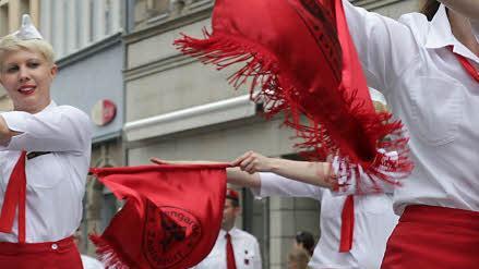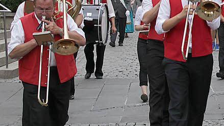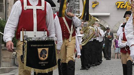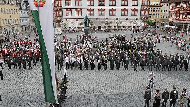 Die Abholung der Traditionsfahne von 1715 am Rathaus ist der offizielle Auftakt zum Vogelschießen. Aus der ganzen Region marschieren Schützenvereine vom Anger zum Marktplatz und wieder zurück. Nicht viele Coburger säumen den Weg, nur wenige öffnen ihre Fenster. Mit Pauken und Trompeten, jede Menge Bläsern und ganz viel guter Laune genießen die Schützen den herrlichen Vormittag. Die Böllerschützen aus Marktzeuln sagen mit fünf Schüssen kräftig "Guten Morgen!" Kaum haben sich die ersten Vereine am Markt aufgestellt, lockern die hinteren Gruppen die Etikette: Handschuhe runter, kurz mal am Albert-Denkmal hinsetzen, Hände und Nacken am Springbrunnen abkühlen.