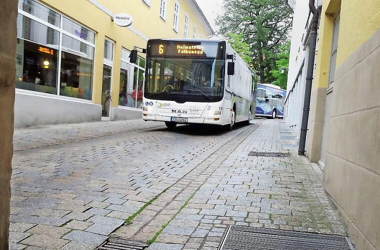 Probleme haben auch die zwei Entwässerungsrinnen in der Georgengasse verursacht, sagt Knoch: Diese Rinnen sind so platziert, dass die Busse immer drüberfahren. "Das hält die beste Entwässerungsrinne und das beste Pflaster nicht aus." Deshalb wird im Zuge der Asphaltierung die Entwässerungsrinne in die Straßenmitte gelegt, wo die Busreifen nicht hinkommen.