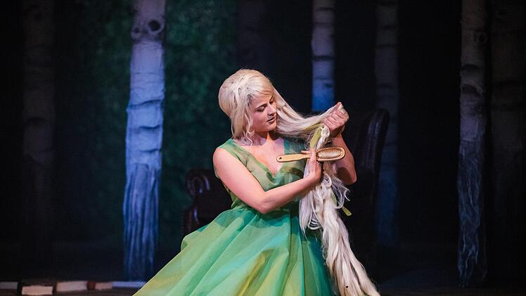 Liebesqual, ach Liebesqual macht die Prinzen so schwach. Den goldenen vom Aschenputtel (Simon van Rensburg) mit Haartolle, der allerdings jede Frau schräg legt. Und den dunklen vom tragischen Rapunzelchen (Emily Lorini) mit den sexy Strumpfhosenbeinchen (Dirk Mestmacher). Die kriegen später übrigens alle Eheprobleme.