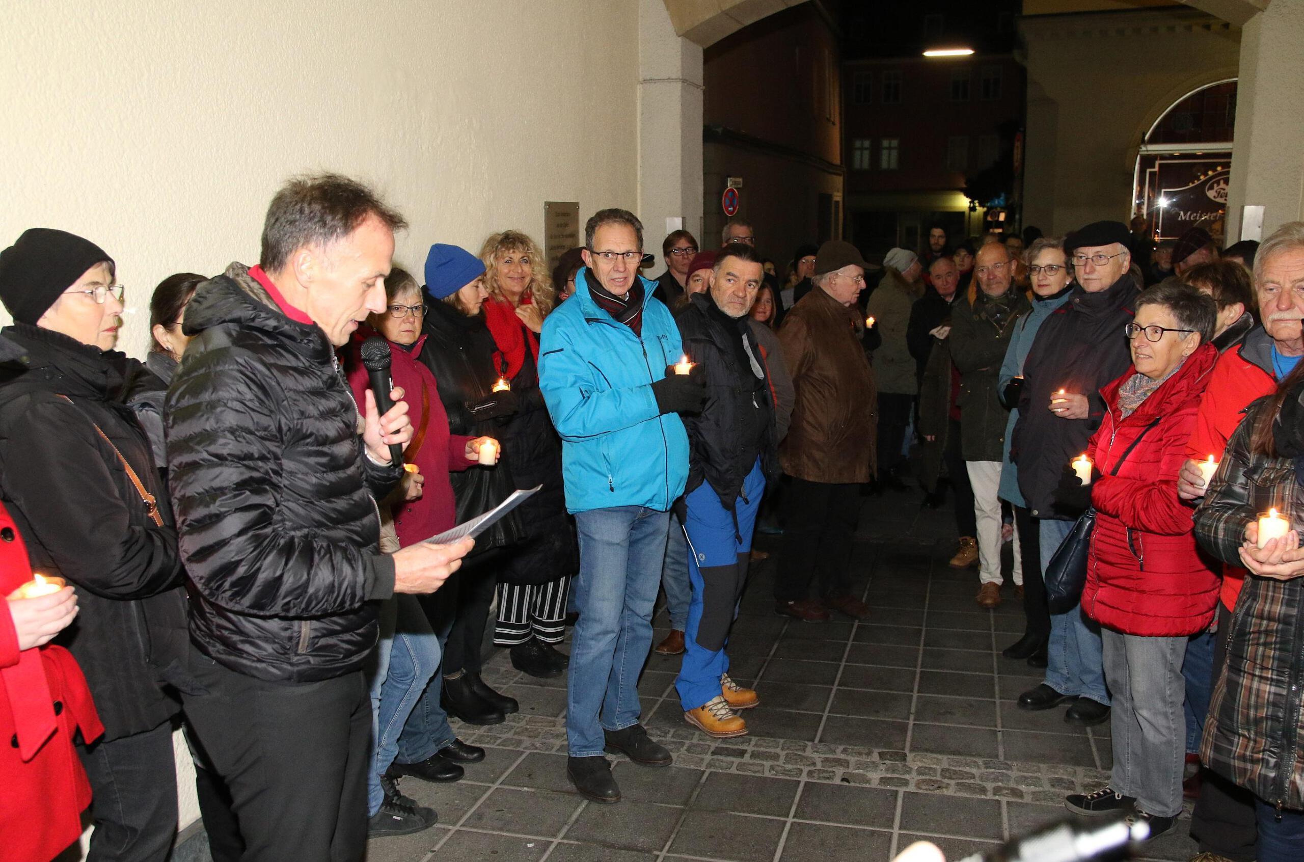 Die ausgewählten Stationen des diesjährigen Gedenkweges "Stätten der Entrechtung" würden die Orte struktureller, verbaler und physischer Gewalt der Nazis gegen jene, die deren Rassenwahn, völkischer und gewaltverherrlichender Ideologie nicht entsprachen markieren, so Dieter Stößlein. "Wir stehen hier, weil wir die Deutung der Geschichte nicht denen überlassen wollen, die diese verharmlosen, den Opfern die Würde nehmen." Die Kultur des Erinnerns, so der Pfarrer, sei ein wichtiger Baustein in einer lebendigen Demokratie. "Wir stehen hier, weil Antisemitismus Menschen zu Mördern macht und wir das nicht hinnehmen wollen. Mit diesem Gedenken sagen wir Nein zu jeglicher Ausgrenzung und Gewaltanwendung gegen Minderheiten. Wir sagen Ja zur Achtung der Würde des Menschen und den Werten, die die Menschenrechte schützen".