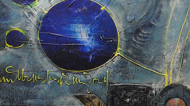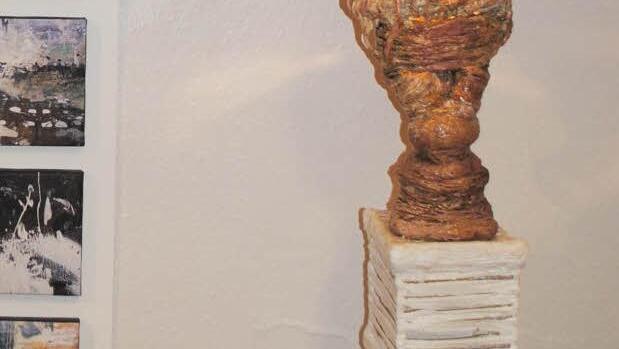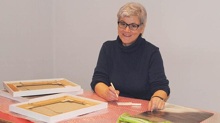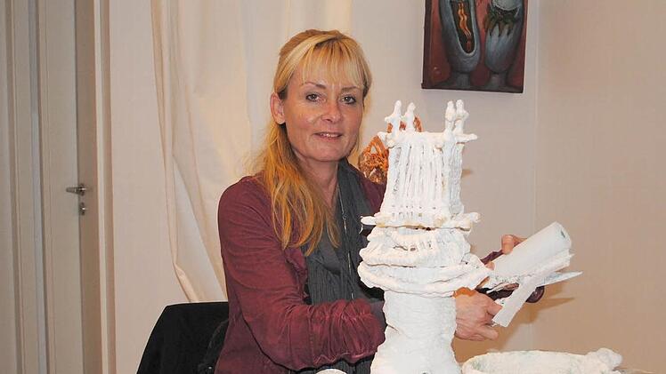 Wobei nicht nur ausgestellt wird. Von 16 bis 20 Uhr, am Sonntag von 17 bis 20 Uhr, sind täglich ein oder zwei von ihnen vor Ort und arbeiten dort: Man darf ihnen durchaus zugucken, mit den Künstlerinnen ins Gespräch kommen - etwa wenn Kerstin Amend-Pohlig ihre vielgliedrigen Skulpturen aus Stein, Metall, Holz, Farbe... wachsen und dann durch LED-Licht aus dem Inneren aufleuchten lässt. Ein "Kunstglühen" der speziellen Art, das sich, so träumen die Künstlerinnen schon, im Frühjahr an anderem Ort in ein "Kunstblühen" verwandeln könnte. Oder wenn Vera Schnitzer an ihren Gemälden, ihren Schrift-Bildern arbeitet.