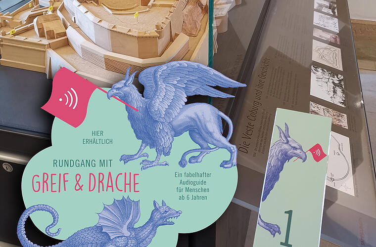 Ein kluger Greif und ein griesgrämiger Drache – das sind die beiden Sprechfiguren des neuen Audioguide-Rundganges, wie die Kunstsammlungen der Veste Coburg mitteilen. Gleich am Burgmodell im Eingangsbereich nehmen Greif und Drache Besucherinnen und Besucher ab 6 Jahren im Empfang. In Form eines Hörspiel-Dialogs führen die beiden Fabelwesen zu 20 Stationen mit ausgesuchten Objekten. Während der grummelige Drache auf der Suche nach Fabelwesen ist, weiß der Greif spannende Geschichten rund um die historischen Räume und Ausstellungsstücke der Veste zu erzählen. Da lernt sogar ein alter Drache etwas dazu! Zum Beispiel, was es mit dem Schanzezimmer auf sich hat, wie Herzog Johann Casimir auf die Jagd gegangen ist oder wer zur Strafe eine Schandmaske aufsetzen musste. Natürlich taucht unterwegs auch Martin Luther oder des Herzogs „Hofzwerg“ auf!