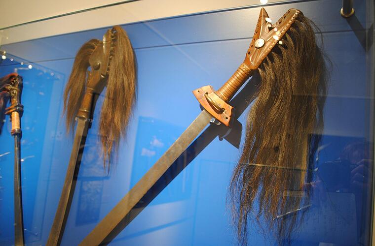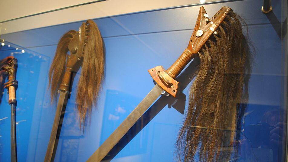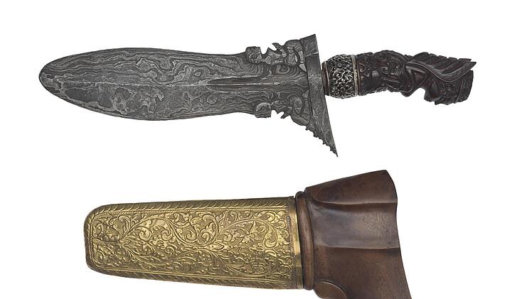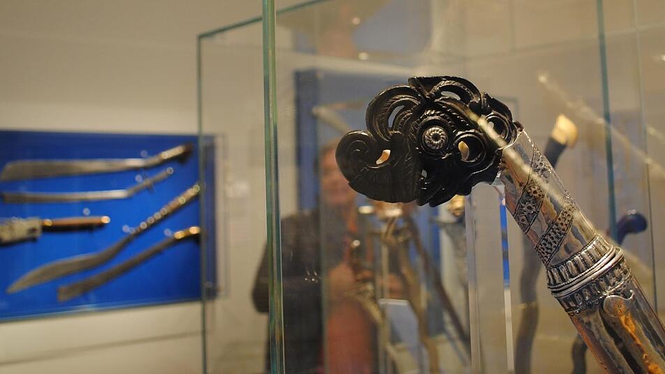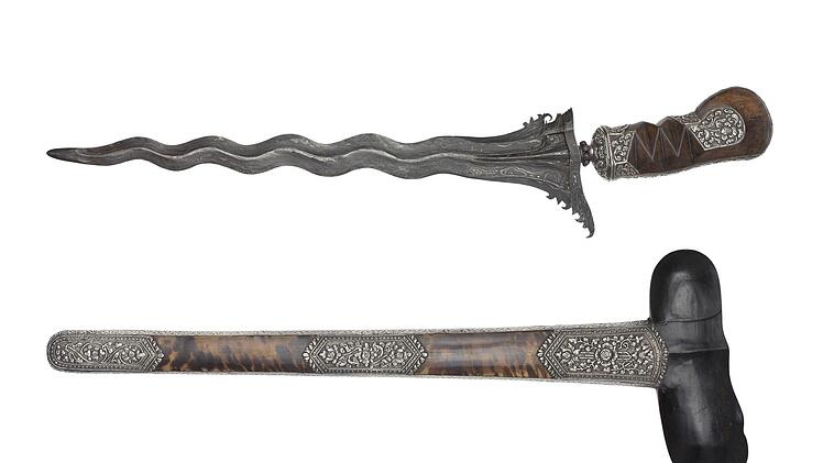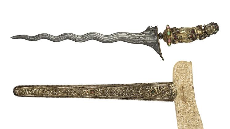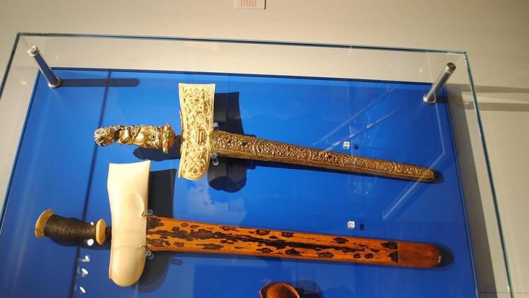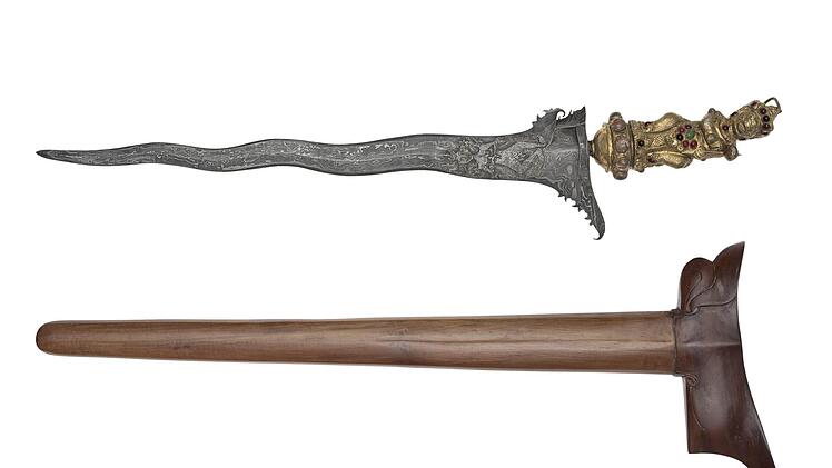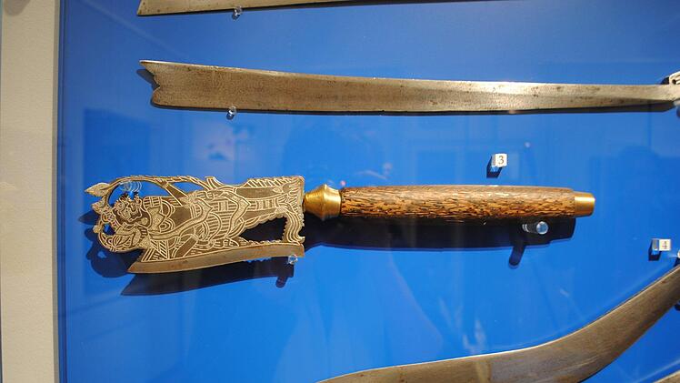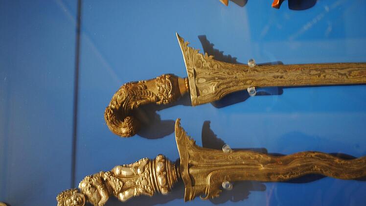 So schön. Und gleichzeitig so tödlich. Die Kunstsammlungen auf der Veste zeigen jetzt eine Auswahl an indonesischen Blankwaffen, Dolche mit geflammten Klingen, eigenwillig geformte Hieb- und Stichwaffen, Schwerter wie aus verrückten Fantasy-Filmen, die Griffe von männlich-weiblichen Dämonen mit langen Eckzähnen besetzt, in wunderschöner Ornamentik oder auch ästhetischer Geradlinigkeit. Aus Borneo kommen behaarte Schwerter, der Griff mit Tier- oder Menschenhaar geschmückt. Wer will schon sagen, woher das genommen wurde.