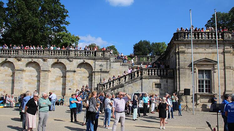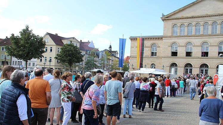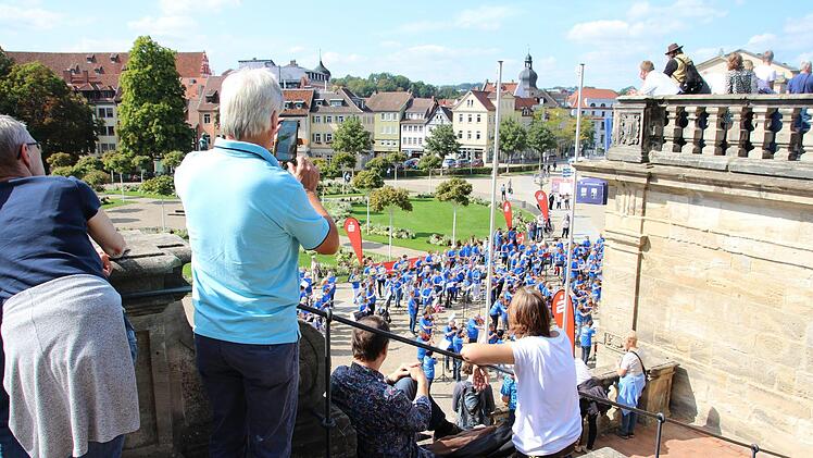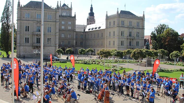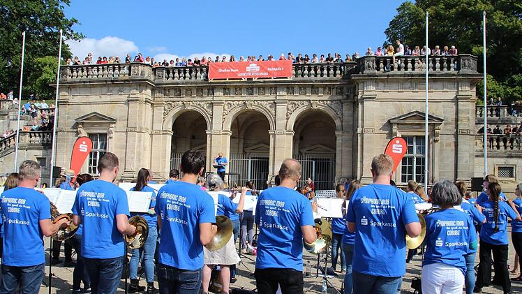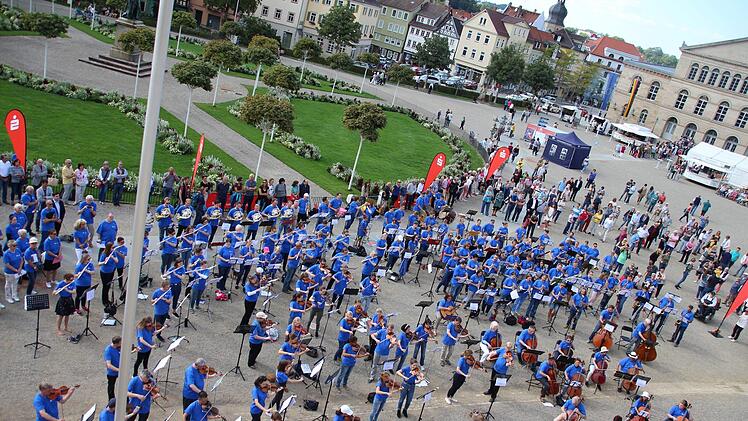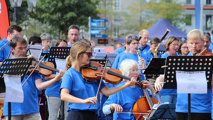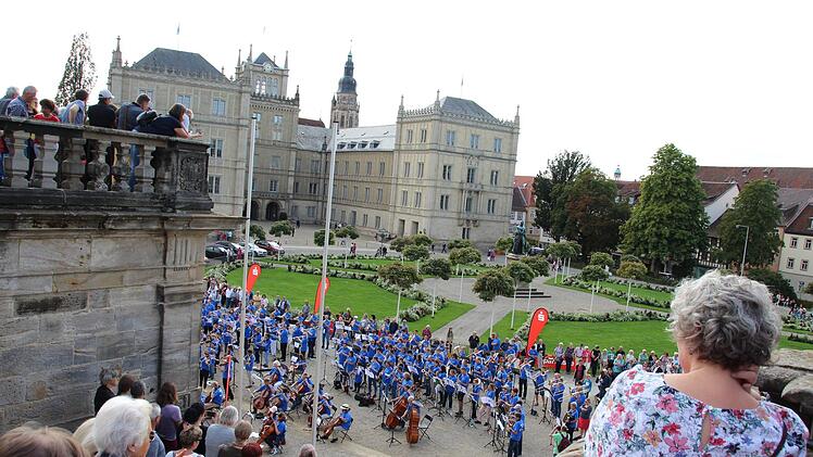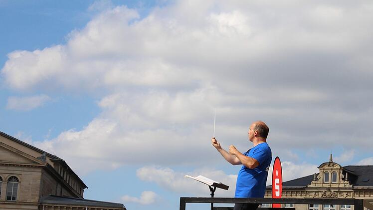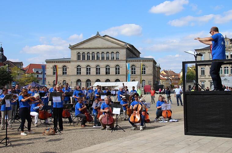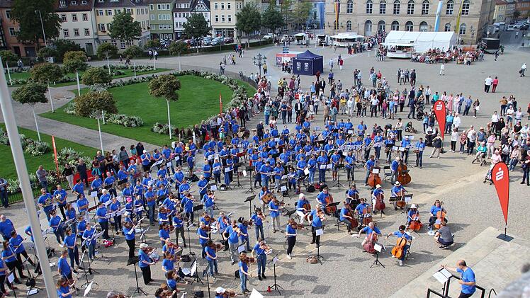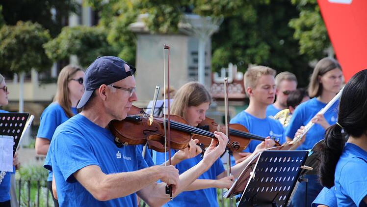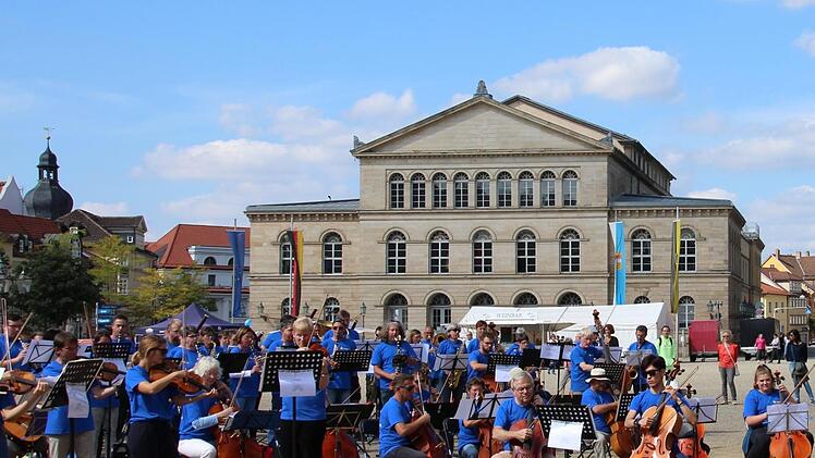 Die Idee fand in den letzten drei Jahren in den Großstädten Resonanz. Und dann auch im kleinen Coburg, das aber schließlich "gefühlte Großstadt" ist, wie Oberbürgermeister Norbert Tessmer bei seiner Begrüßung konstatierte. Junge und Alte vereinten sich am Samstag mit Musikern des Philharmonischen Orchesters; Kluttig begrüßte sogar den 90-jährigen Heribert Rosenthal, früher Solotrompeter an der Staatsoper Stuttgart. Und um es gleich zu sagen, das halbstündige Konzert wurde zu einem auch die Zuhörer sogar gesanglich mitreißenden Erlebnis. Die gerade mal eine Stunde vorher zusammengekommenen Mitstreiter im "Coburg Schlossplatz Orchestra", wie es Dirigent Roland Kluttig bewusst zukunftsweisend am Schluss nannte, formten sich tatsächlich zu einem beherzt aufspielenden Klangkörper mit beachtlich sattem Streicherklang und kraftvollen Bläsern.