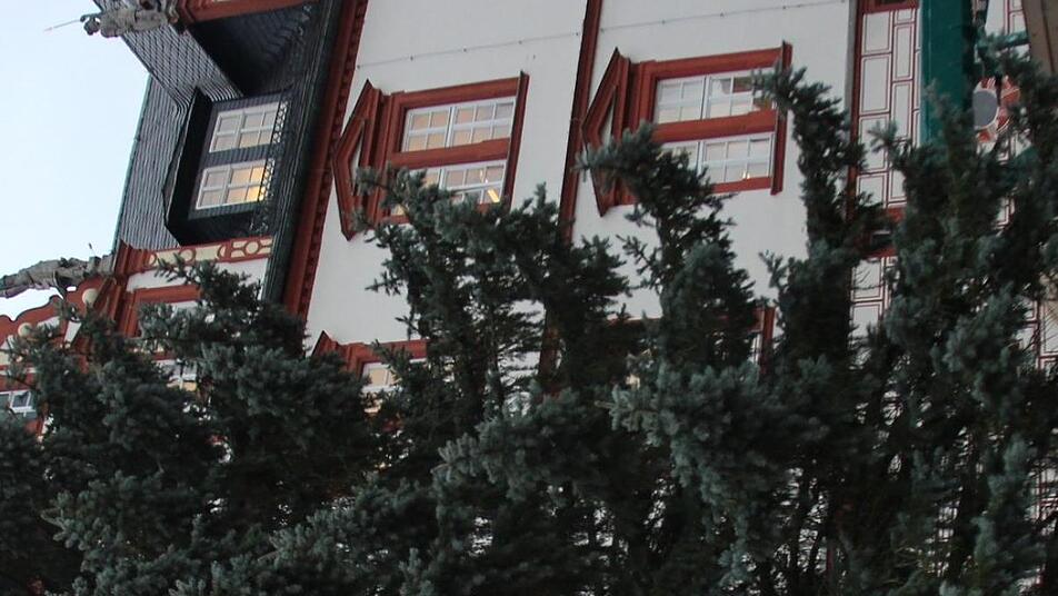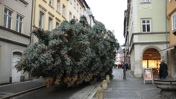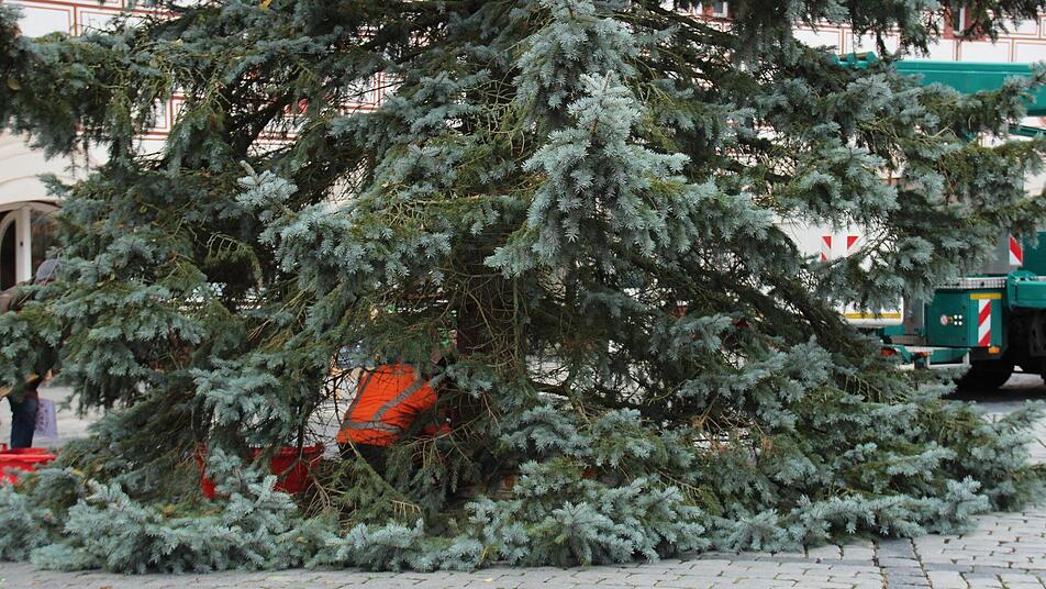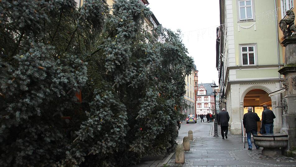 Mit Polizeischutz eskortiert, mit Kran eingelassen: der Weihnachtsbaum thront seit Montag auf dem Coburger Marktplatz.