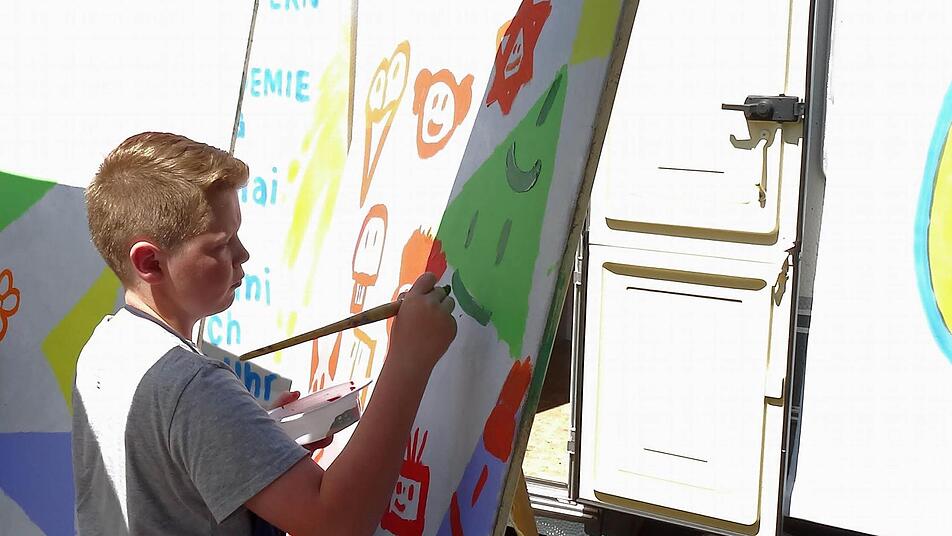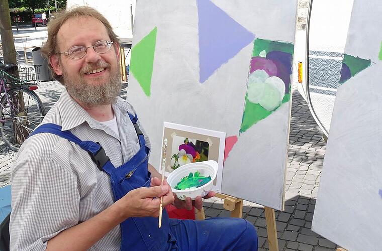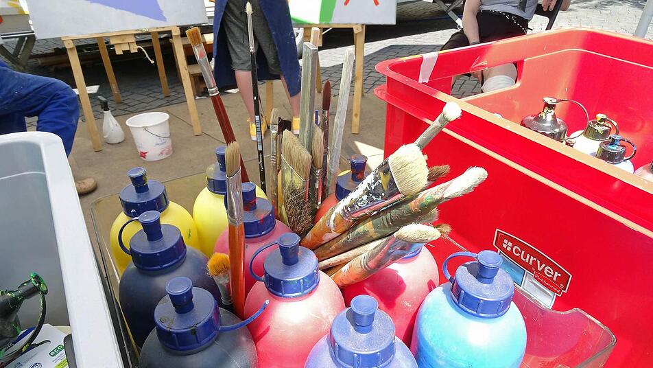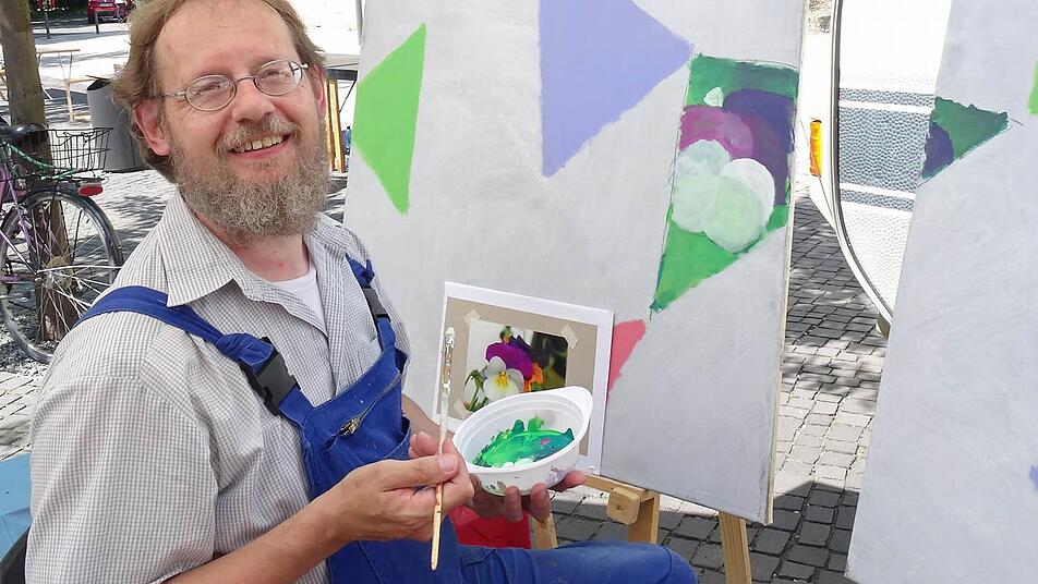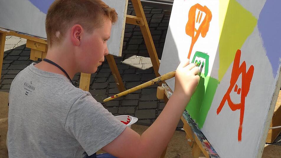 Heiß ist es in Peter Schoppels Freiluft-Atelier auf dem Albertsplatz. Doch den Maler aus Gundelsheim stört die Hitze ganz und gar nicht. Unter zwei großen Sonnenschirmen sitzt er vor einer weiß grundierten Leinwand und malt Blumen in hellen, freundlichen Farben. Zwei Leinwände weiter rechts malt Paul aus Coburg mit kräftigen Farben lustige Gesichter. Der Zehnjährige ist zufällig vorbeigekommen beim "Atelier auf Zeit" und nutzt die Gelegenheit, sein Talent auf großem Format auszuprobieren - mit sichtbarer Freude und klaren, entschlossen gesetzten Linien.