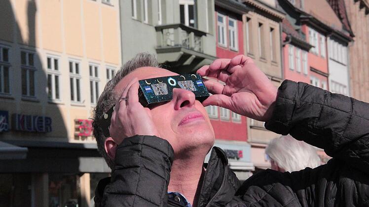 Schubert teilte sich deshalb am Freitagvormittag in Coburg die Spezialbrille mit einem Kollegen. Die beiden hatten ihre Mittagspause vorgezogen, um vom Coburger Marktplatz aus einen Blick auf die Sonnensichel zu werfen. Um 10.39 Uhr hatte
