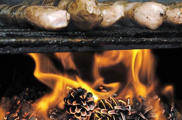 Zwar wurden auch Buchenscheite aufgelegt und der Rost angehoben, doch ob dadurch die Wurst weniger krebserregende Stoffe enthält, bleibt offen. Ein Hinweisschild macht darauf aufmerksam, dass auf Kiefernzapfen gebraten wird.