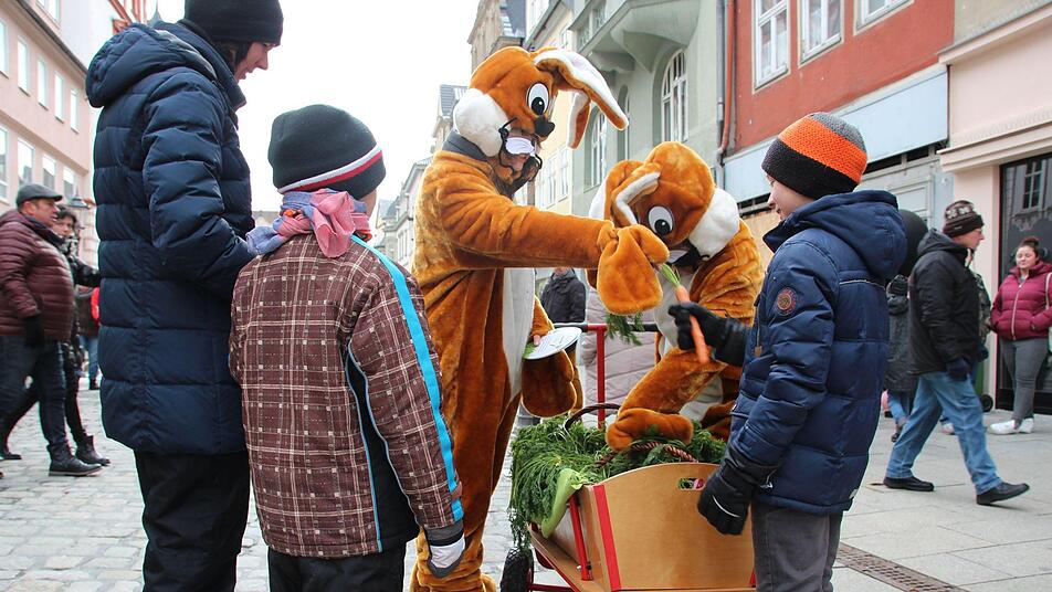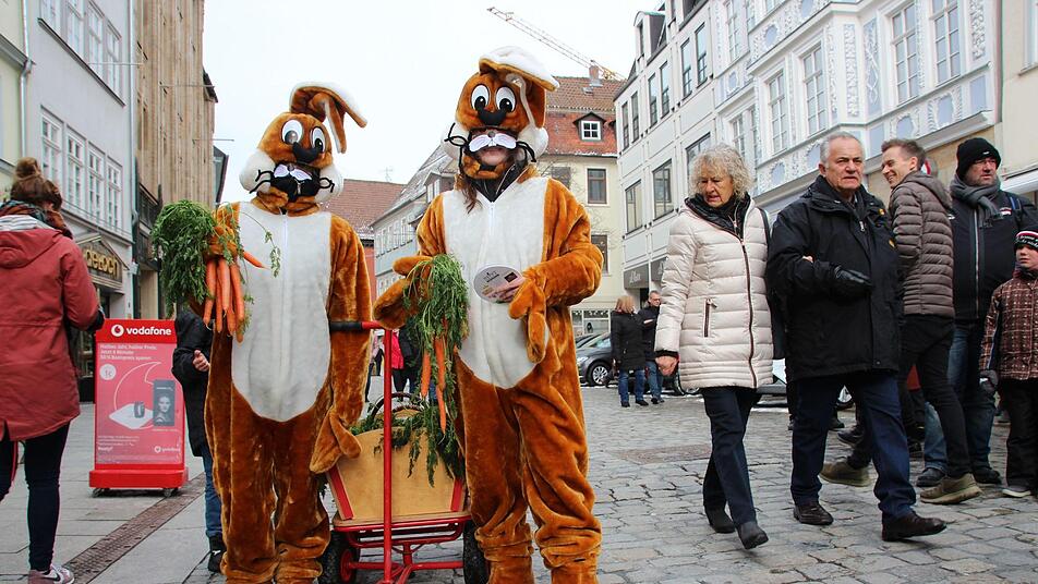Was kommt den da angerollt? Die beiden Osterhäschen Antonia und Helen ziehen mit einem Handwagen durch die Stadt. der ist prall gefüllt mit Möhren und Flyern aus der Markthalle. Die beiden jungen Mädchen verteilen fleißig - und kommen dabei sogar ins Schwitzen. Die flauschigen Kostüme halten schön warm.