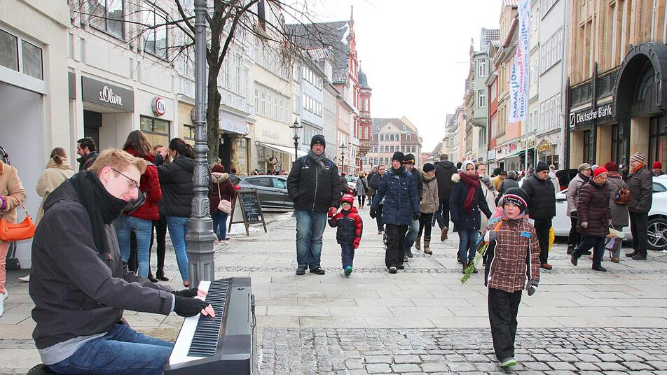 Vielleicht hätte sich Andreas Wolf auch was überlegen sollen, um nicht gar so arg zu frieren. Immerhin hat er ein paar Handschuhe mit abgeschnittenen Fingerkuppen angezogen. Mehr geht nicht, denn der 24-Jährige möchte schließlich zeigen, was er kann. Und dazu sitzt er auf einem Schemel in der Spitalgasse und spielt Eigenkompositionen auf dem Klavier. Die Fußgänger danken es im mit einem Lächeln, aufmunternden Blicken und dem ein oder anderen Euro. Andreas Wolf strahlt übers ganze Gesicht: "Meine Finger spüre ich eigentlich gar nicht mehr, aber es geht trotzdem. Ich wundere mich selbst!" Erst vor vier Jahren hat der Coburger das Klavierspielen gelernt und mit dem Komponieren angefangen. Seit Oktober studiert er in Weimar Musik und hofft, eines Tages von seiner eigenen Musik leben zu können. Bewundernswert!