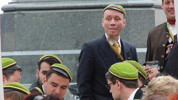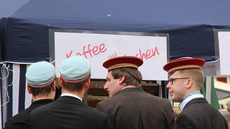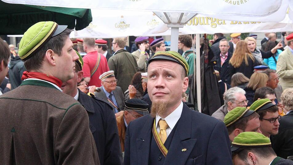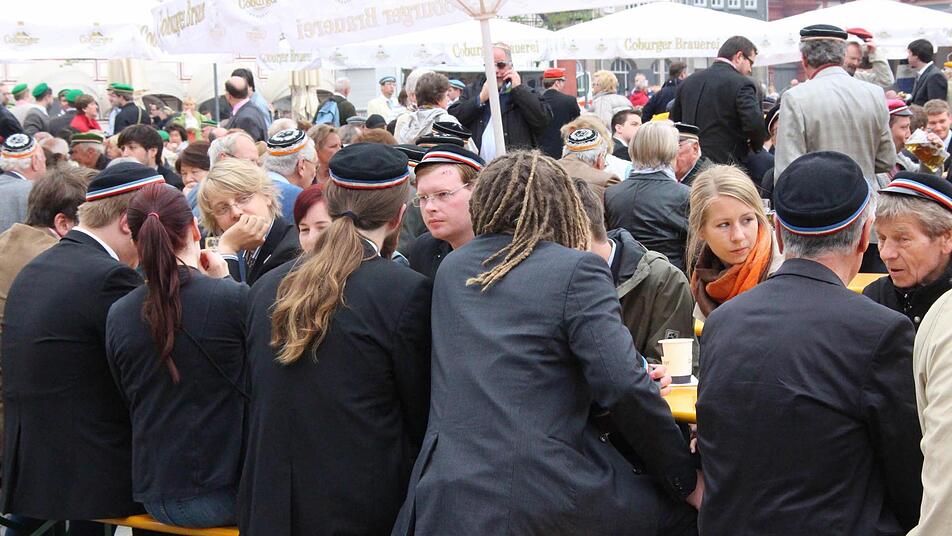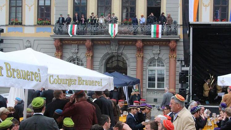 Bunte Mützen prägen das Bild auf dem Coburger Marktplatz am Dienstagvormittag. Der Frühschoppen bildet traditionsgemäß den Abschluss des Pfingstkongresses des Coburger Convents - und begründet manche alte Freundschaft neu.