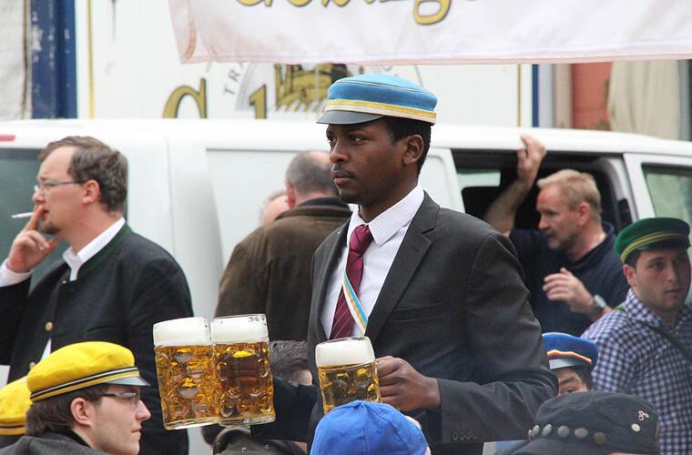Für viele der Alten Herren sei der jährliche Coburg-Besuch eine Reise in die eigene Vergangenheit und Jugend, sagt Vera Romahn. Damals dürfte es jedoch noch keine Aktiven mit Rastazöpfen gegeben haben. Jonas van Dinter sitzt mit Bundesbrüdern und Freundinnen am Tisch der Slesvico Holsatia, die seit 1987 mit der Cheruskia Kiel fusioniert ist. Van Dinter ist nicht der einzige Bundesbruder am Tisch, der auf einen akkuraten Kurzhaarschnitt verzichtet.