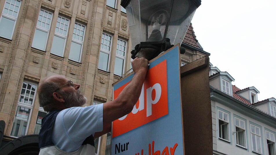 Schon um 15.15 Uhr lächelt Norbert Tessmer (SPD) am Freitag vorm Rathaus und gleich mehrfach in der Spitalgasse. Das Konterfei von Hans Michelbach (CSU) steht an der Ecke Marktplatz/Judengasse - hier kommt vorbei, wer zum Parkhaus Mauer läuft. In der Spitalgasse hängt Klaus Klumpers die ÖDP-Plakate an die Straßenlaternen ("man muss auch mal was selber machen"), am Gräfsblock zieht Manfred Schott die Stirne kraus: "Hier hatte ich eigentlich immer welche stehen", murmelt er.