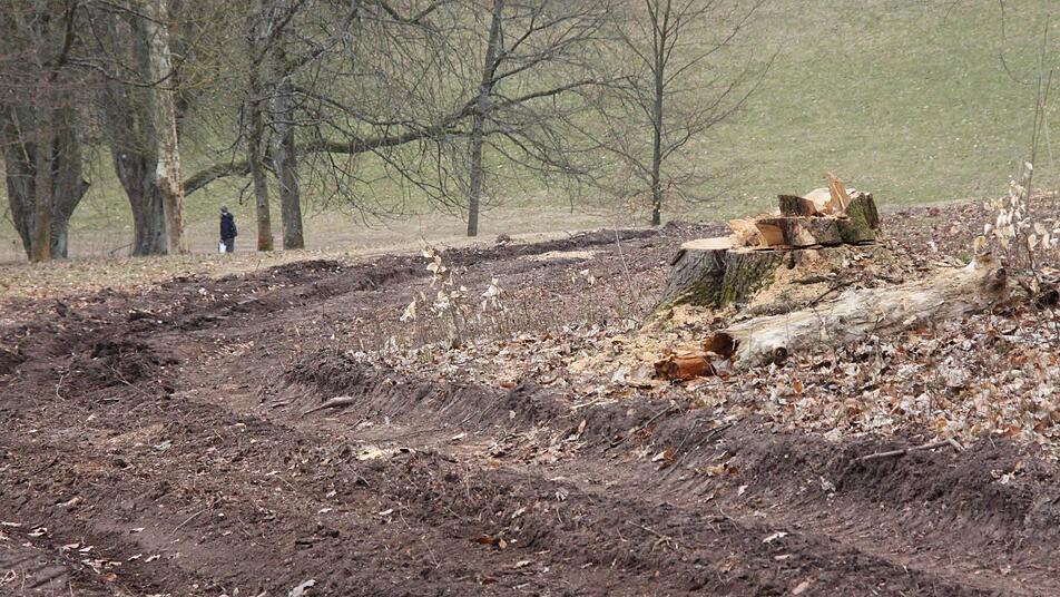 Als nächstes werden die Furchen in der Wiese planiert, die die Fahrzeuge hinterlassen haben. Dann müssen die Wege gerichtet werden - auch das gehört zum Parkpflegewerk und wäre ohnehin fällig gewesen, auch ohne Sturm. Der hat freilich einige der Treppengeländer verbeult oder ganz abgerissen. Die hölzernen Wasserrinnen in den Wegen sollen durch gepflasterte ersetzt werden, erläutert Ledermann.