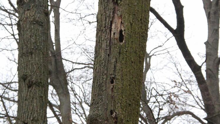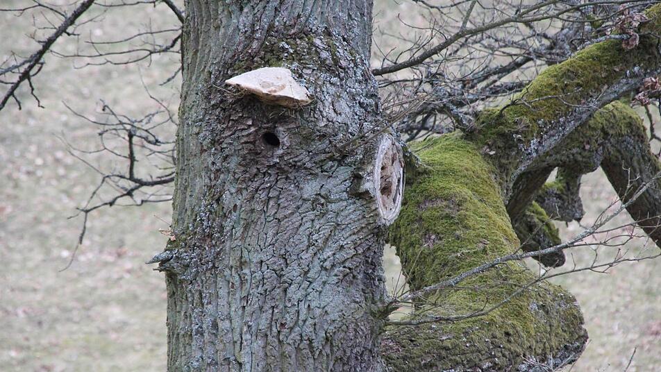 Aber abseits der Wege im oberen Veilchental und direkt unterhalb der Veste dürfen kaputte Stämme auch stehen bleiben, um als Biotopbäume Höhlen für Vögel und Eichhörnchen zu bieten oder unter der Rinde Lebensraum für Käfer.