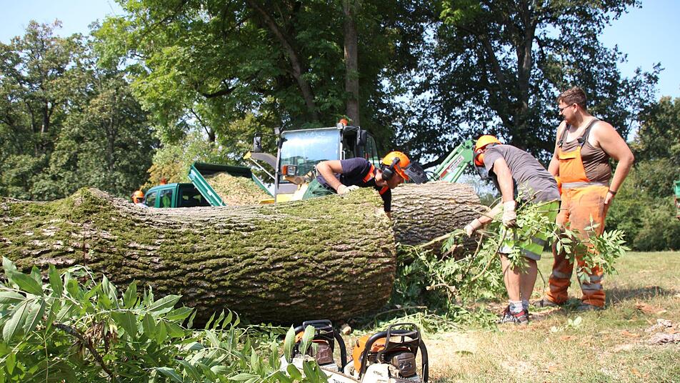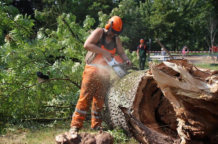 Hagel, literweise Regen und ein Dorf weiter schon wieder strahlender Sonnenschein: Das Gewitter setzte nicht nur dem Hofgarten stark zu, verschonte andere Gebiete aber komplett. Von umgestürzten Bäumen auf privaten Grundstücken sei dem Grünflächenamt bisher aber nichts bekannt. Während die Arbeiter den Stamm der Esche durchsägen, brennt die Sonne auf ihre orangen Helme herab. Mitarbeiter Stefan Freitag deutet zur Blutbuche hinüber. "Wir fangen noch mit dem Zersägen an, aber fertig werden wir heute sicherlich nicht mehr."