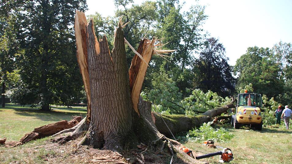 Ein Stamm der Esche knickte schon am Montagabend gegen 18 Uhr um. Den zweiten Stamm des gabelförmig gewachsenen Baumes musste das Grünflächenamt am Dienstagvormittag vorsorglich fällen, weil er alleine nicht mehr standsicher war. Mit ordentlicher Wucht sei das Gewitter durch den Hofgarten gefegt, sagt Ledermann. Verletzt wurde durch die umstürzenden Bäume niemand.
