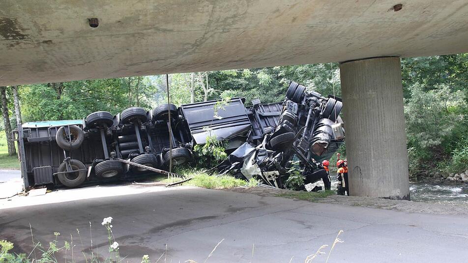 Der 44-jährige Fahrer des Sattelzugs war gegen 13 Uhr am Ende der vierstreifigen B4 auf die Gegenfahrbahn geraten, hatte einen Audi gestreift, das Brückengeländer durchbrochen und war in die Itz gestürzt. Sowohl der Fahrer des Audi als auch der Lasterfahrer konnten sich selbst aus ihren total demolierten Fahrzeugen befreien; weitere Unfallbeteiligte gab es nicht.
