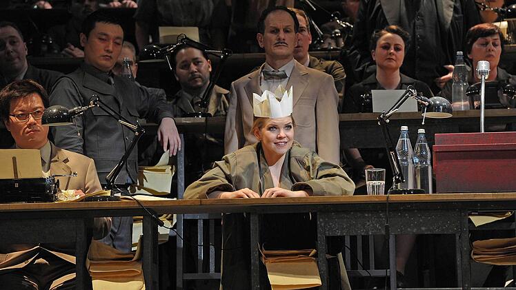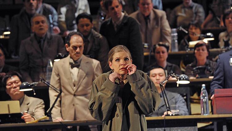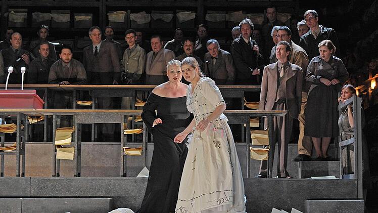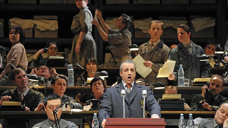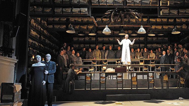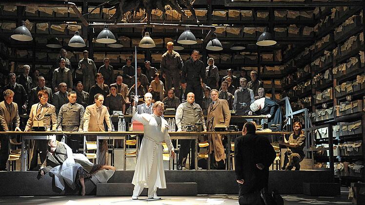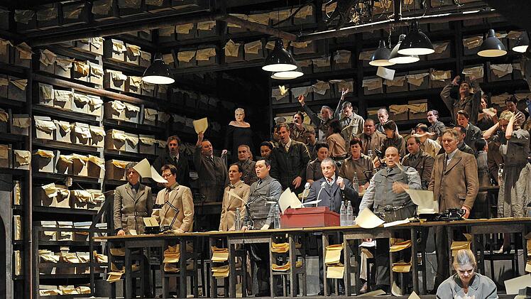 Die Chormassen (tadellos einstudiert von Lorenzo Da Rio), die in anderen Inszenierungen oft peinlich statisch herumstehen und auf der engen Coburger Bühne ohnehin kaum sinnvoll zu bewegen wären, werden in dieser Lesart zu Mitgliedern eines Parlaments, das immer mehr in Aufruhr gerät. Das Einheits-Bühnenbild von Rifail Ajdarpasic mit aufsteigenden Sitzreihen, eingerahmt von hohen Regalreihen, die bis hinauf mit Kisten voller Akten gefüllt sind, entfaltet machtvolle Bildwirkung.